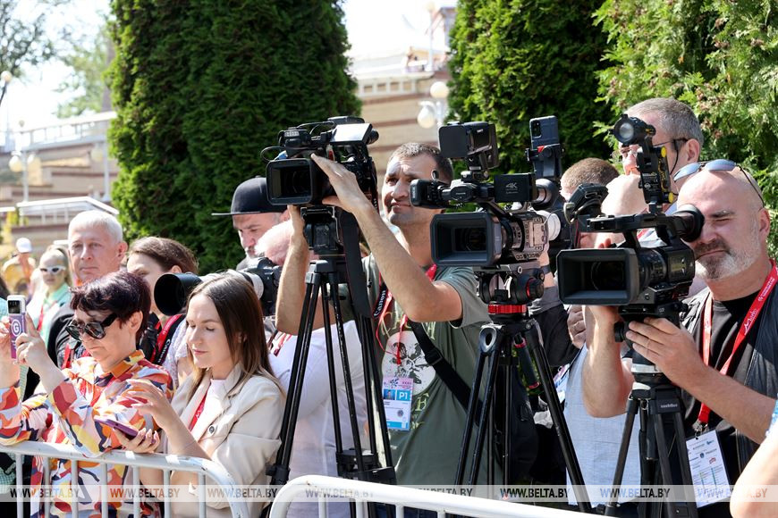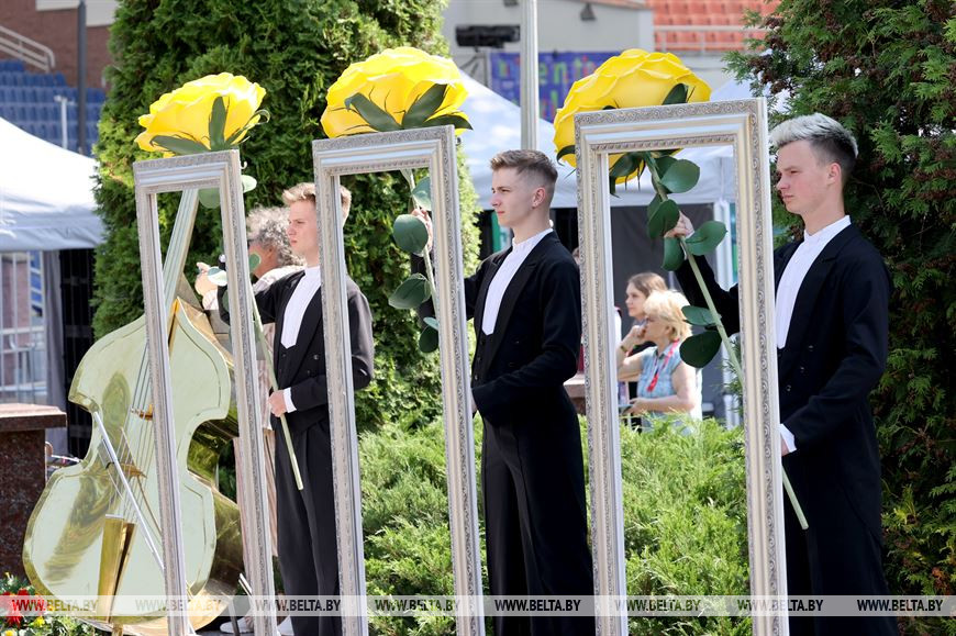 Министр начал поздравление на белорусском языке, отметив, что слова "Гаворыць i паказвае Вiцебск" всегда открывают международный фестиваль искусств в Витебске, и звучат они из уст прекрасной женщины, бессменной ведущей церемонии открытия - Елены Спиридович.