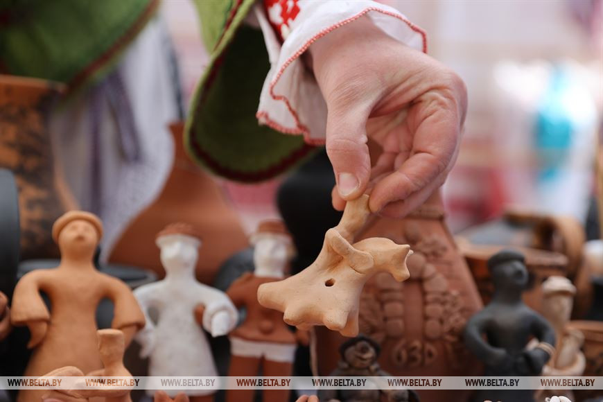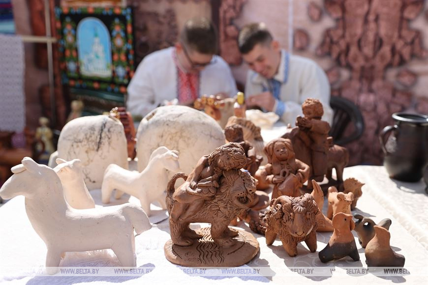 У человека, попадающего на открытую площадку Верхнего города, сразу разбегаются глаза от количества экспозиций. Здесь и изделия из соломы, и ткацкие станки, и гончарные изделия, и резьба по дереву. На ярмарке можно не только посмотреть на народное творчество, но и поучаствовать в мастер-классах. Супруги Сергей и Анна Рымденок - одни из мастеров, кто подготовил такой мастер-класс. Они учили посетителей делать игрушки из глины.
