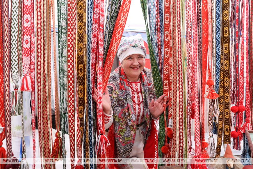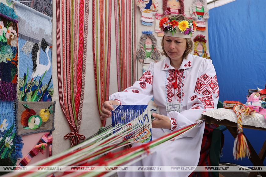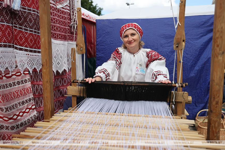 На выставке представлено ткачество в различных его видах: рушники, одежда, пояса. Были показаны не только сами изделия, но и процесс их изготовления. Руководитель кружка Крупицкого центра культуры имени В.Н.Грома Ирина Дернаковская рассказала о фестивале и своем ремесле. "Я народный мастер по ткачеству и делаю белорусские пояса, занимаюсь этим около 15 лет. Эта работа далась мне легко, она у меня на генетическом уровне. Обе мои бабушки занимались ткачеством. Сейчас я с удовольствием тку белорусские народные пояса", - сказала Ирина Дернаковская. Помимо самого ткачества, она собирает традиционные белорусские узоры и изучает их значение, а также обучает детей. "У меня с удовольствие ткут даже мальчики", - отмечает она.