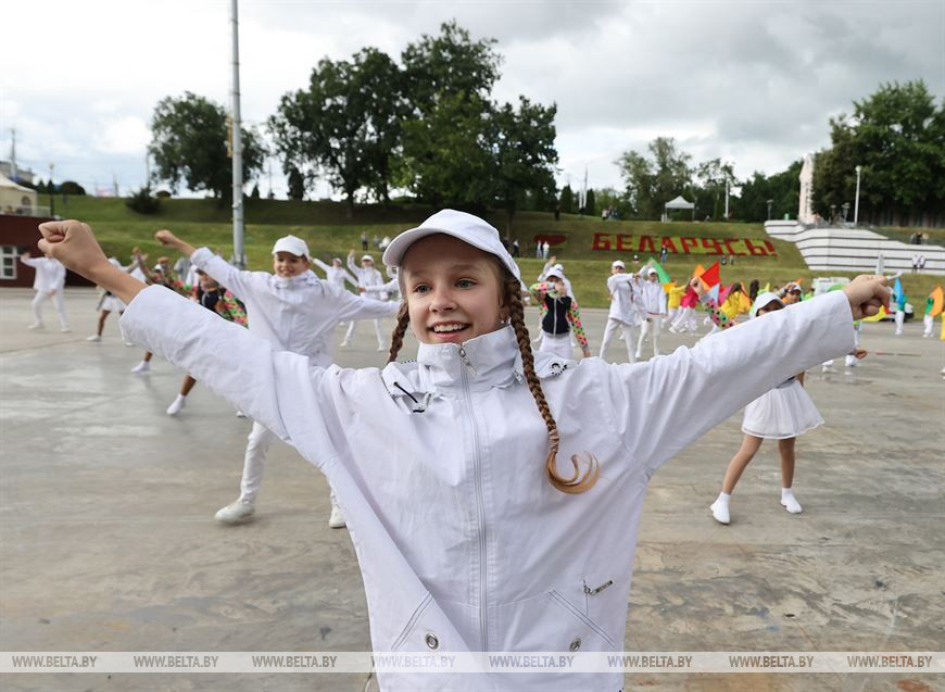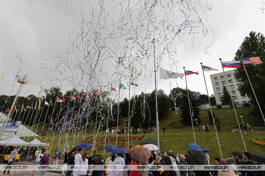 Белое полотнище с фестивальной символикой пронес кругом почета над Летним амфитеатром вертолет витебского аэроклуба. Церемонию поднятия флага дополнило хореографическое выступление витебских ребят, которые прошли по площадке рядом с амфитеатром с разноцветными флагами.