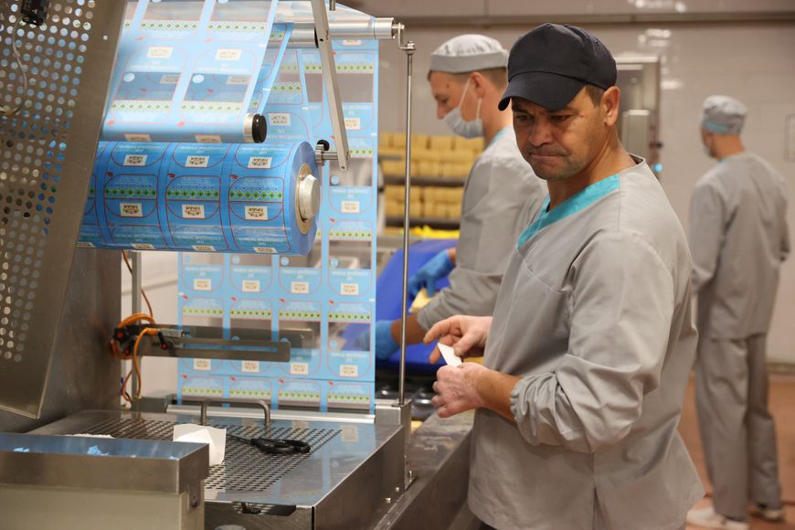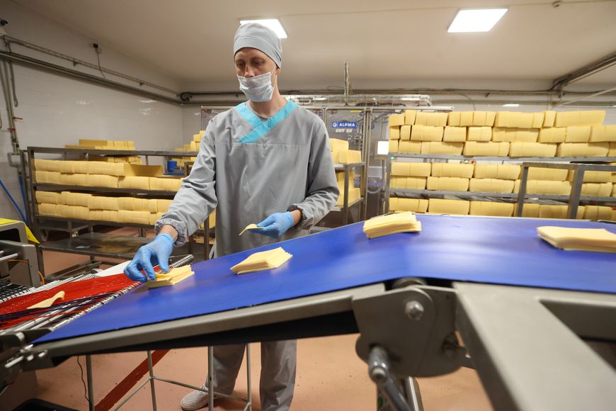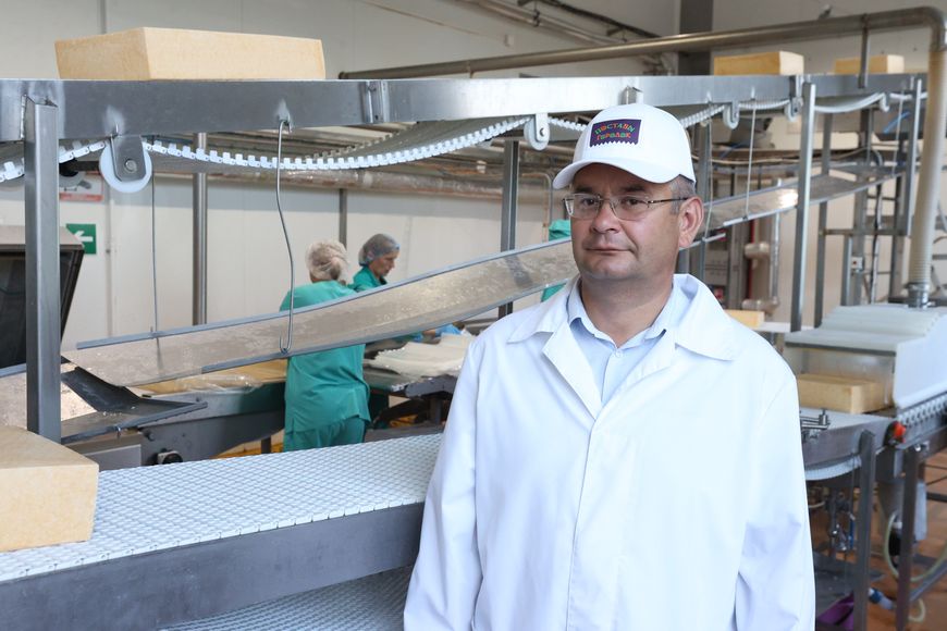 Рабочий день был в разгаре, и очередная смена заводчан только успевала складывать в короба разные виды сыров: в индивидуальной упаковке в виде бруска весом 200 г и нарезки – тончайших ломтиков весом поменьше – 150 г. Предприятие в таком виде реализует до 30% произведенных сыров.