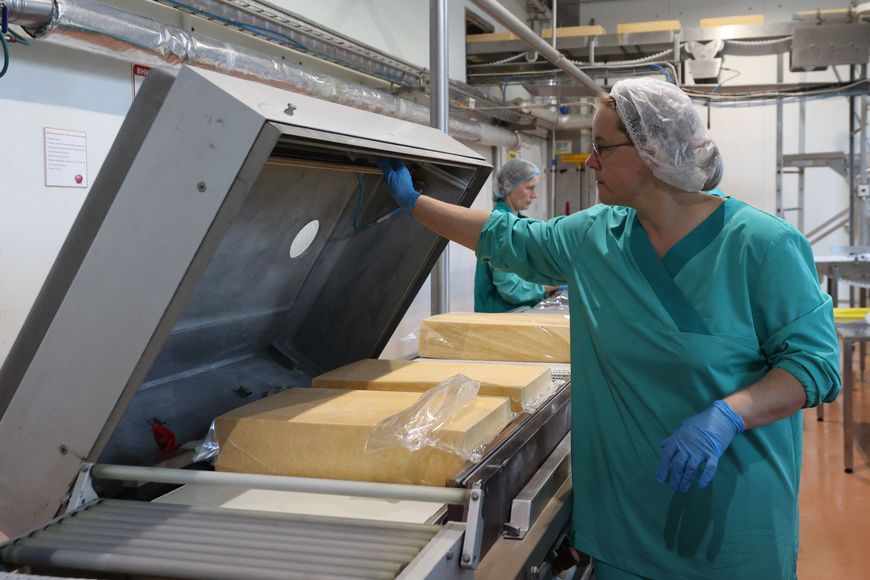 Посетили мы и участок нарезки и фасовки сыров.
