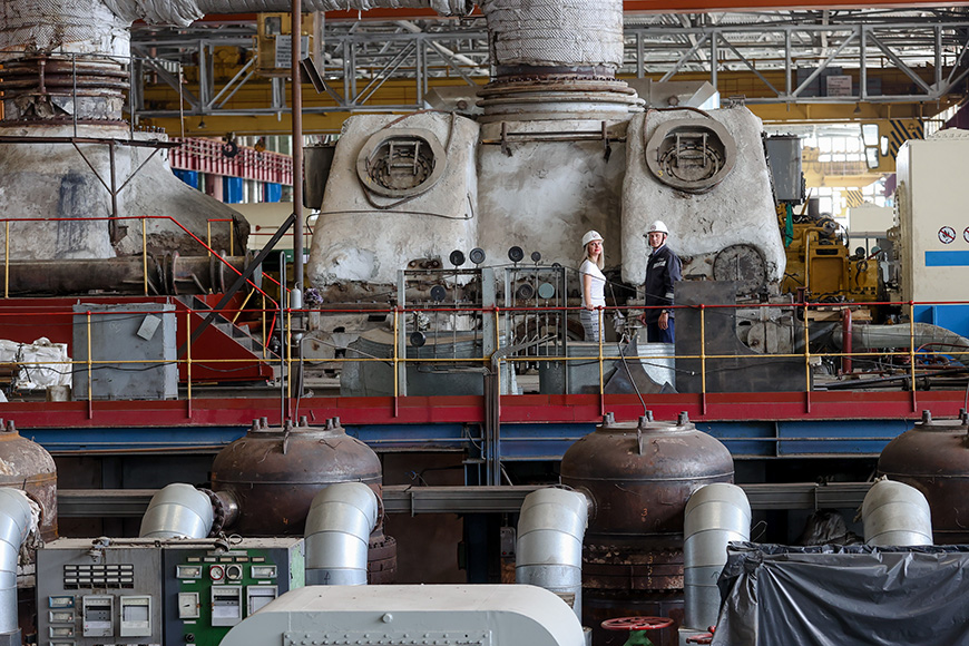 Внутри теплоэлектроцентрали – постоянный шум от работы турбоагрегатов, снующие туда-сюда специалисты. Видно, что механизм отлажен как часы. Однако одна из турбин молчит – здесь и проводится текущий ремонт. На агрегате снята изоляция и другие конструктивные части.