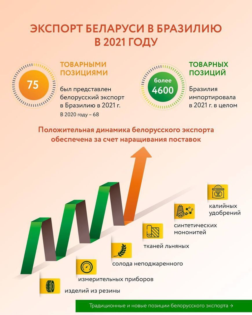 "В целом в прошлом году Бразилия импортировала более 4,6 тыс. товарных позиций, при этом номенклатура белорусского экспорта в Бразилию была представлена 75 товарными позициями (в 2020 году - 68 товарных позиций). В 2021 году объем торговли между Беларусью и Бразилией составил $782,9 млн, что выше показателя 2020 года на 8,9%", - сообщили в НЦМ.
