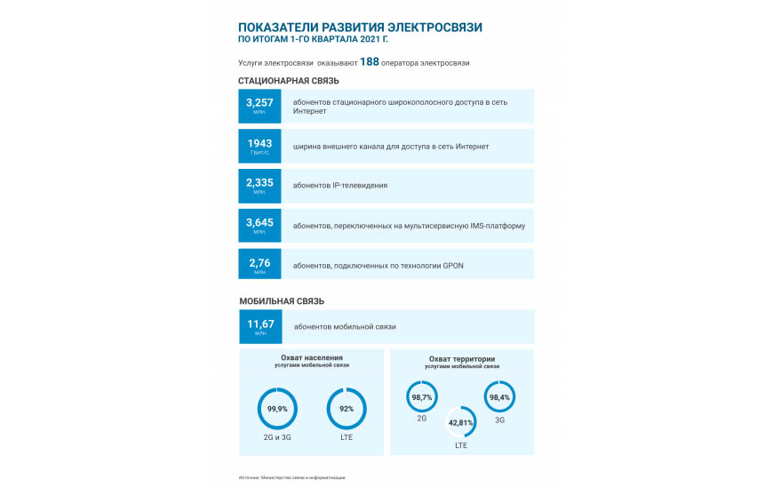 Ширина внешнего канала для доступа в сеть Интернет возросла на 143 Гбит/с и составила 1943 Гбит/с. Число абонентов сотовой подвижной электросвязи также неуклонно растет и на 1 апреля насчитывало 11,67 млн.