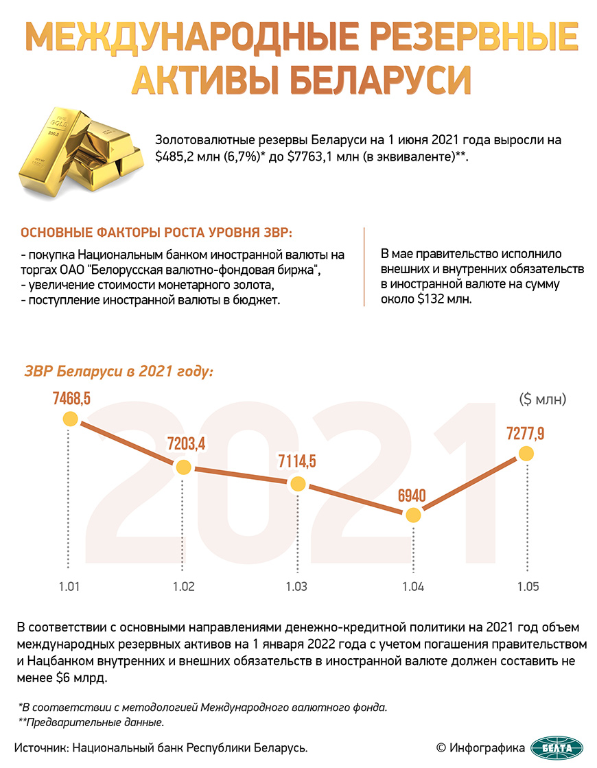 7 июня, Минск /Корр. БЕЛТА/. Международные резервные активы Беларуси на 1 июня 2021 года, по предварительным данным, составили $7 763,1 млн. в эквиваленте, сообщили БЕЛТА в управлении информации и общественных связей Национального банка.