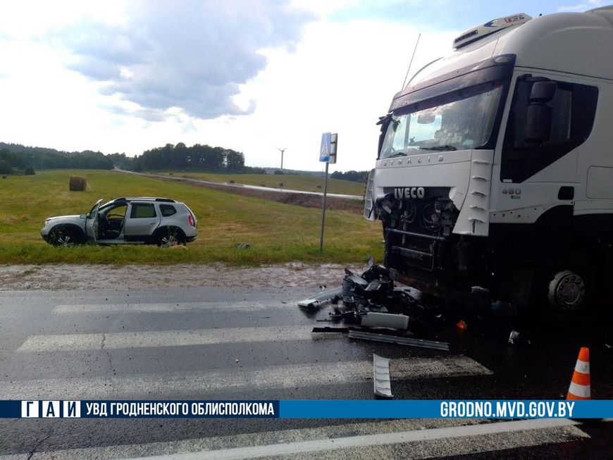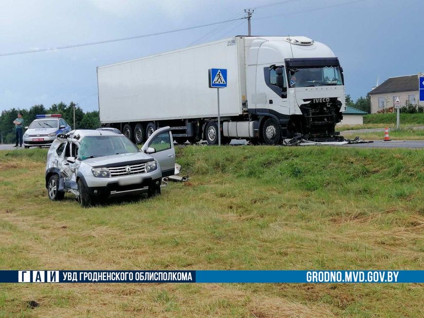 Авария произошла днем 20 июля у деревни Кмитянка Новогрудского района. Водитель кроссовера "Рено" выезжал со второстепенной дороги и не предоставил преимущество большегрузному автомобилю.