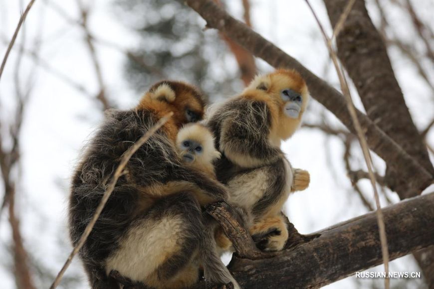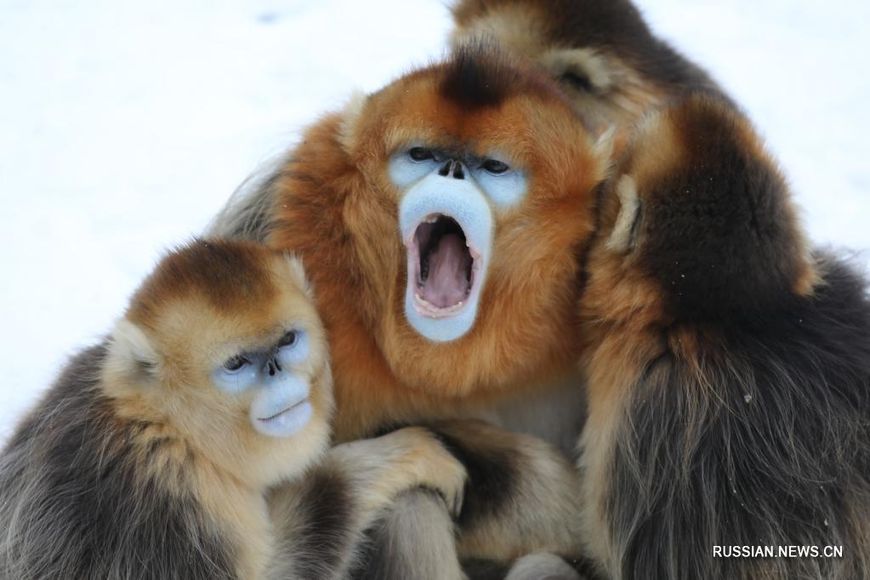 13 января, Шэньнунцзя /БЕЛТА - СИНЬХУА/. В государственном парке Шэньнунцзя на территории базы по исследованию золотистых обезьян "Далунтань" можно наблюдать за играющими на снегу золотистыми обезьянами.-0-