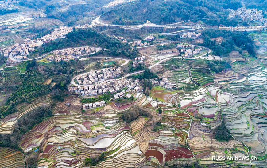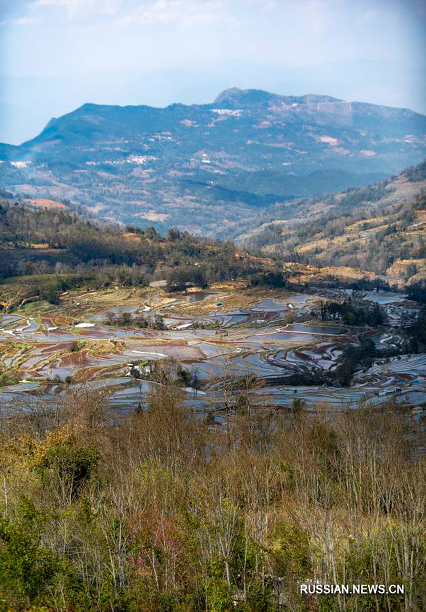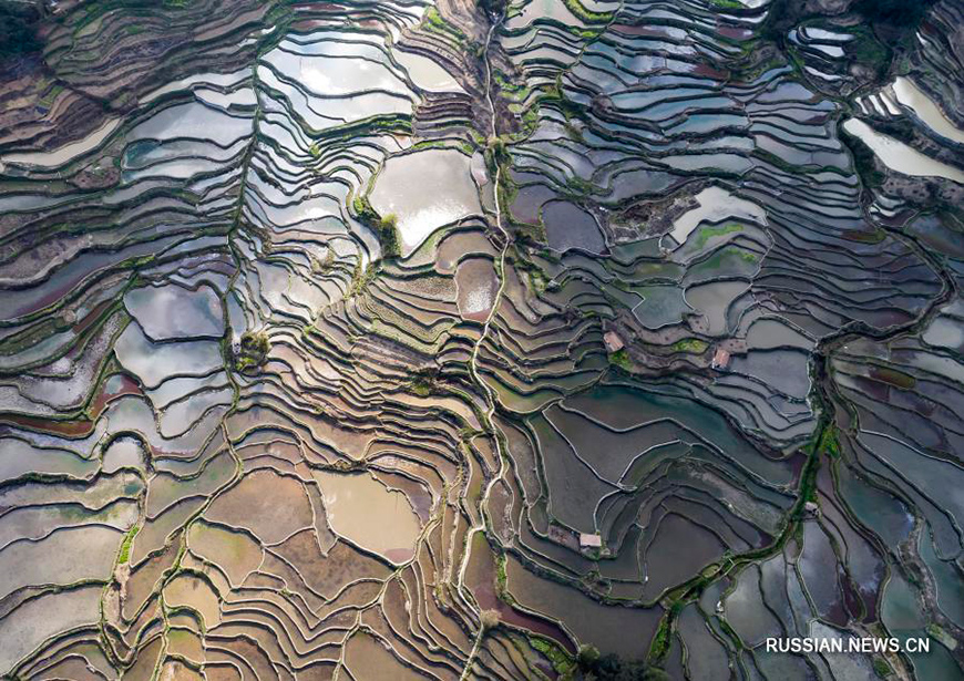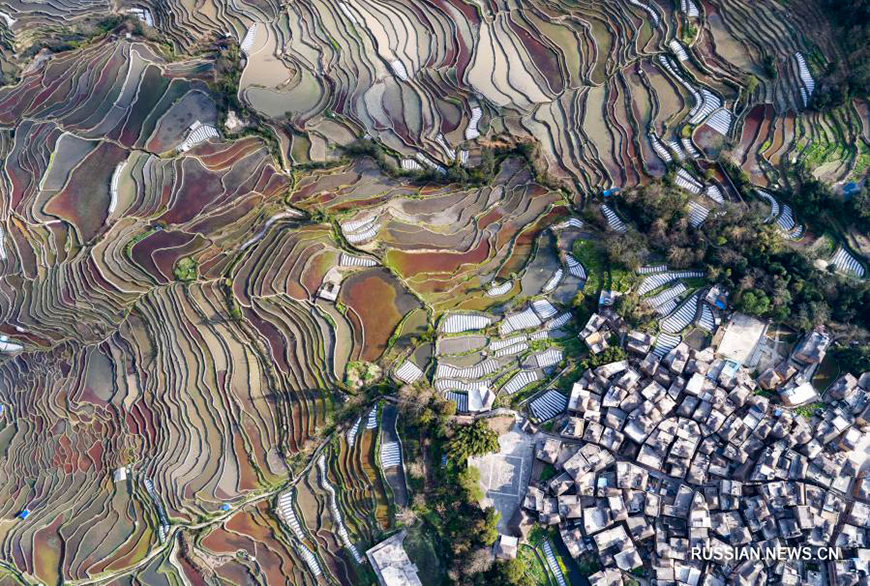 2 марта, Юньнань /БЕЛТА - СИНЬХУА/. Ханийские террасные поля, которые находятся в уезде Юаньян Хунхэ-Хани в провинции Юньнань (Юго-Западный Китай), в весенние дни приобретают особое очарование, постоянно меняя цветовую гамму в зависимости от освещения.-0-