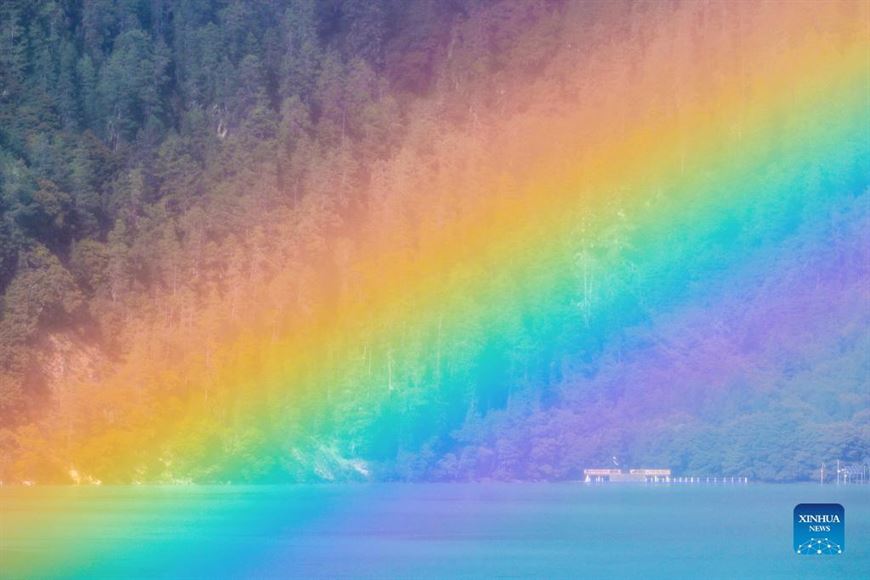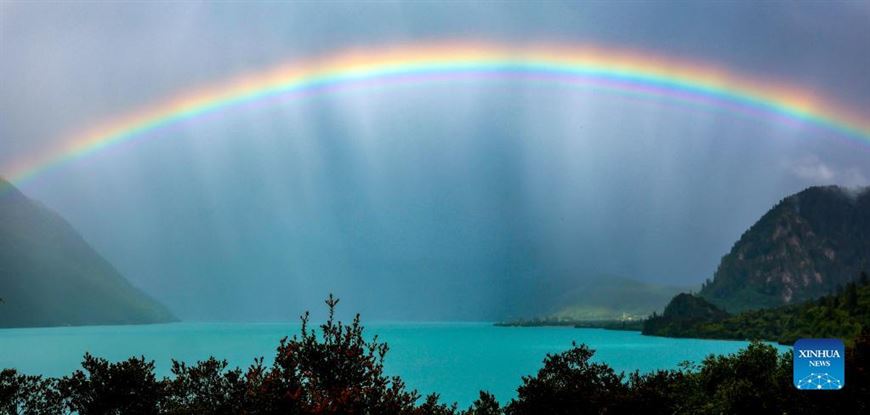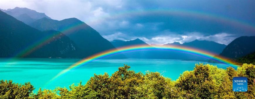 31 августа, Ньингчи /БЕЛТА - СИНЬХУА/. Радуга раскрасила небо над озером Басум в городе Ньингчи Тибетского автономного района на юго-западе Китая.-0-