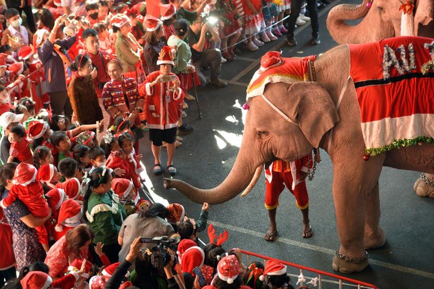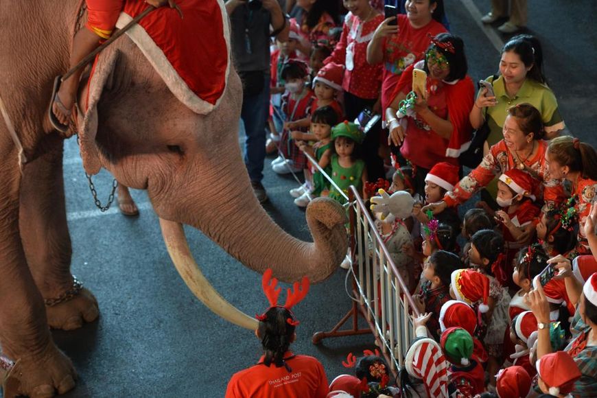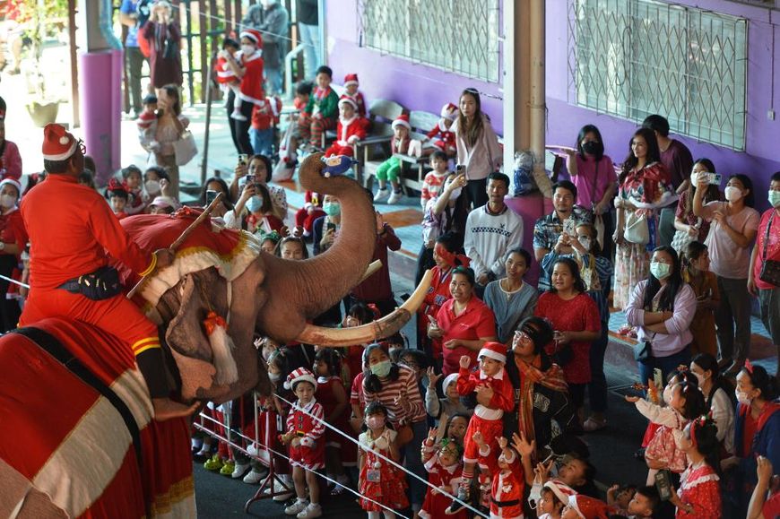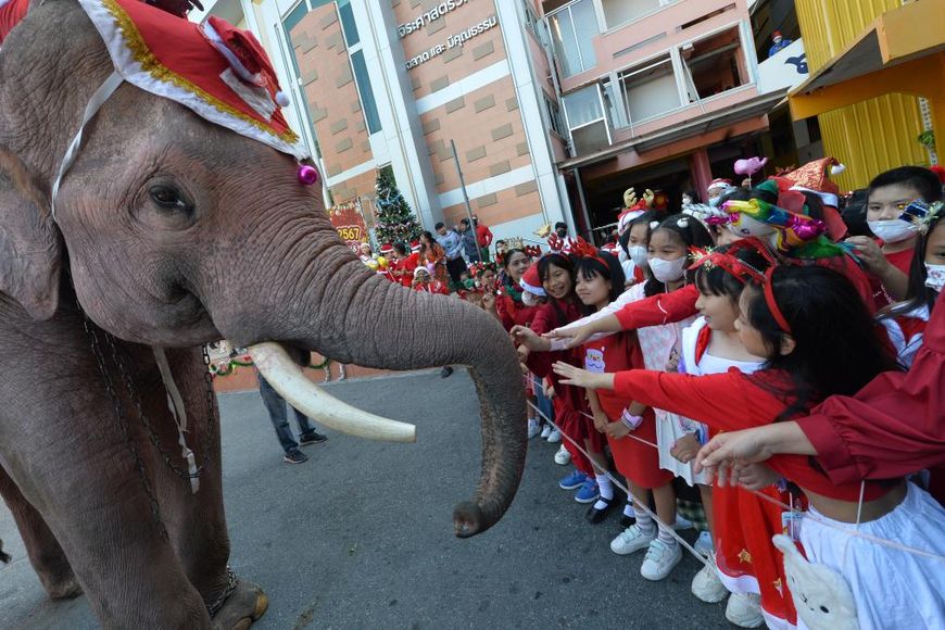 22 декабря, Аюттхая /БЕЛТА - СИНЬХУА/. Каждое Рождество в провинции Аюттхая в Таиланде дрессировщики слонов переодеваются в Санта-Клаусов и, катаясь на слонах, дарят детям подарки для популяризации местных традиций.-0-
