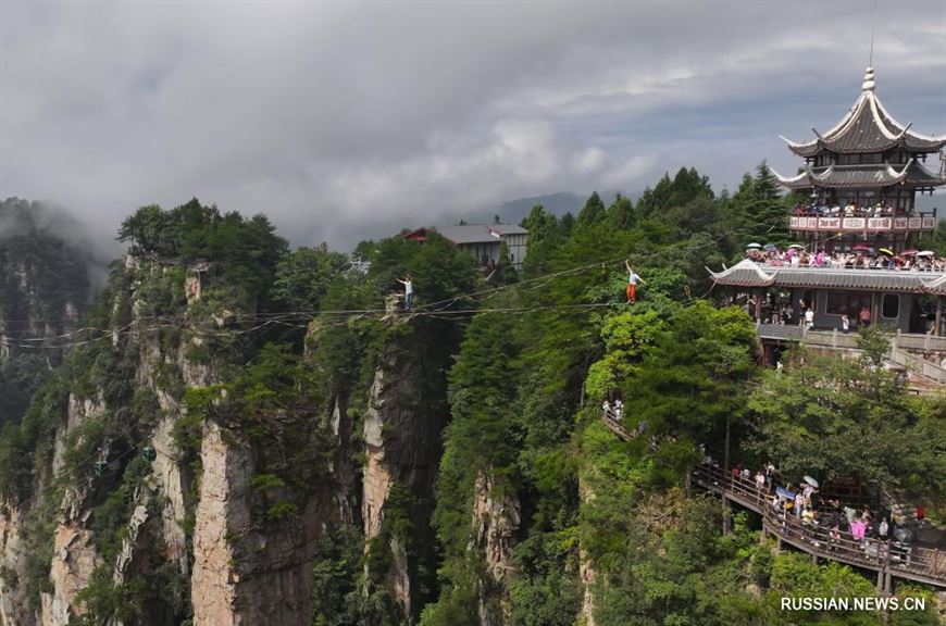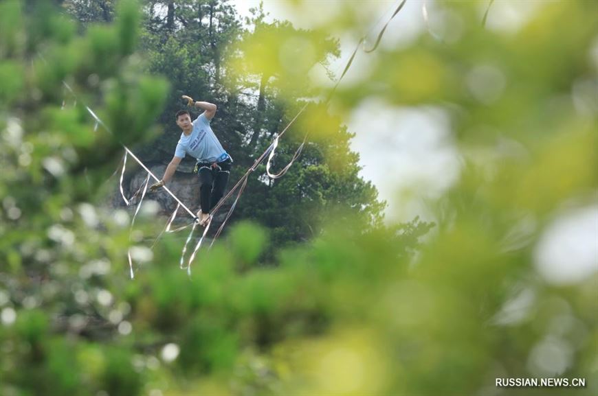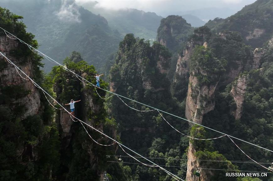 23 августа, Хунань /БЕЛТА - СИНЬХУА/. Соревнование по слэклайну (стропохождению) с участием спортсменов из Китая, Франции, Испании и других стран стартовало в живописном районе Хуаншичжай города Чжанцзяцзе провинции Хунань.-0-