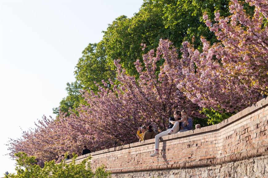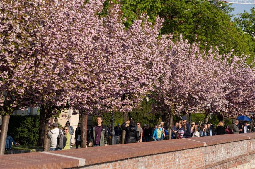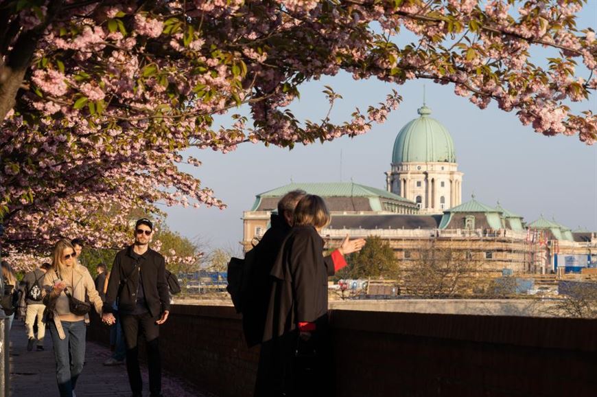 22 апреля, Минск /Корр. БЕЛТА/. Прохожие наслаждаются весенними днями под цветущей вишней на Замковой горе в Будапеште, сообщает Синьхуа.-0-