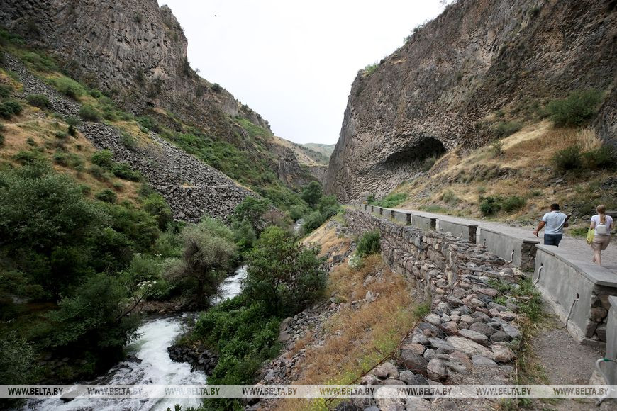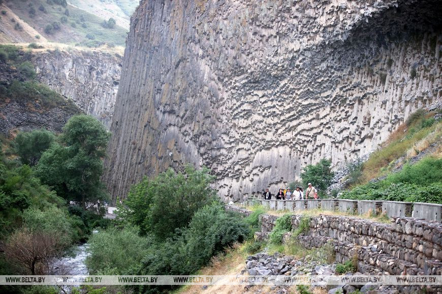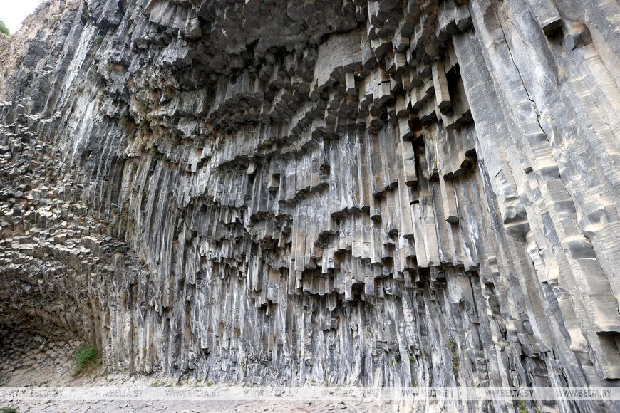 18 июля, Минск /Корр. БЕЛТА/. В Армении возле Еревана находится уникальный природный памятник под названием "Симфония камней". Он представляет собой ущелье, скалы которого состоят из огромных базальтовых столбов, нависающих над землей на высоте около 50 метров. Такие скалы образуются при резком застывании лавы. Они отличаются особой формой, в виде шестиугольников, которые расположены вертикально.-0-