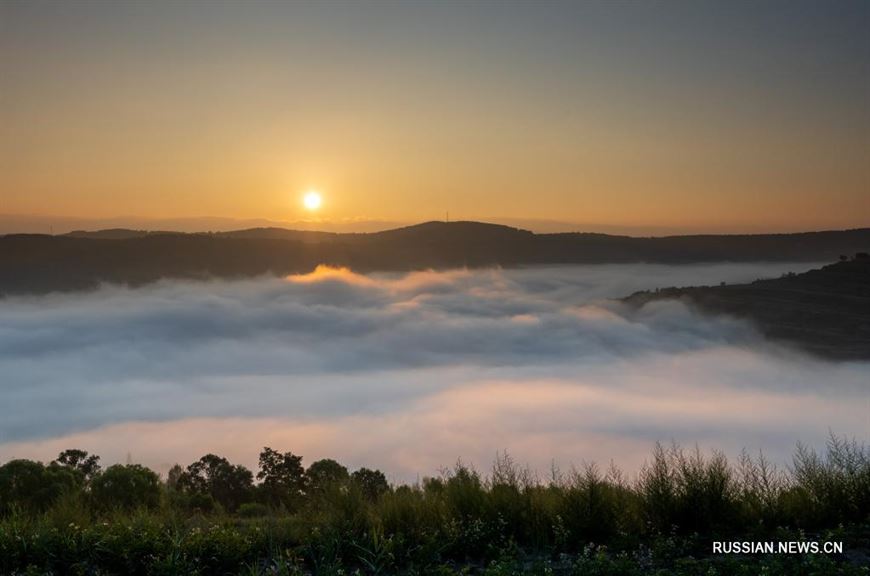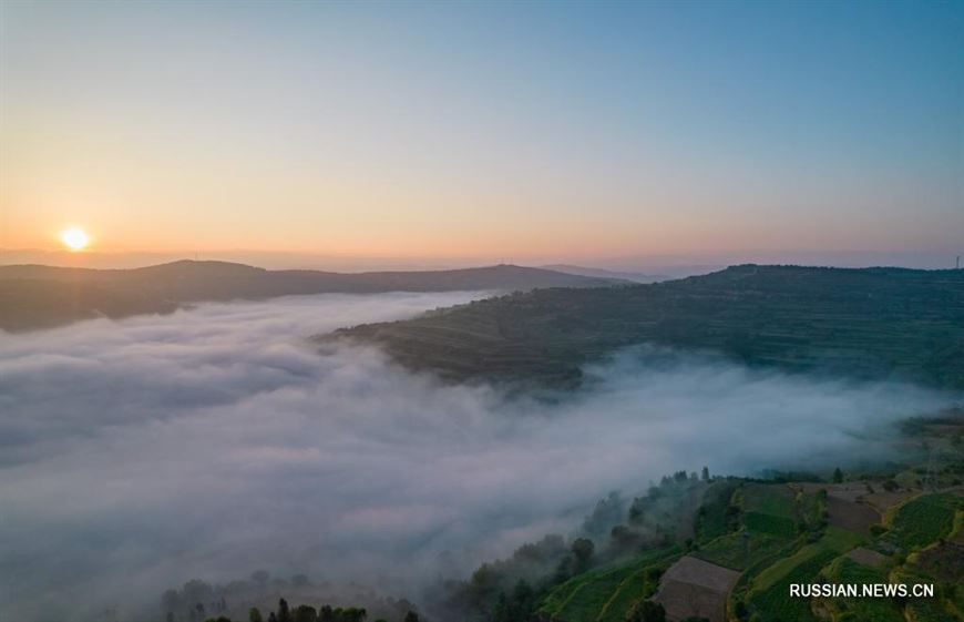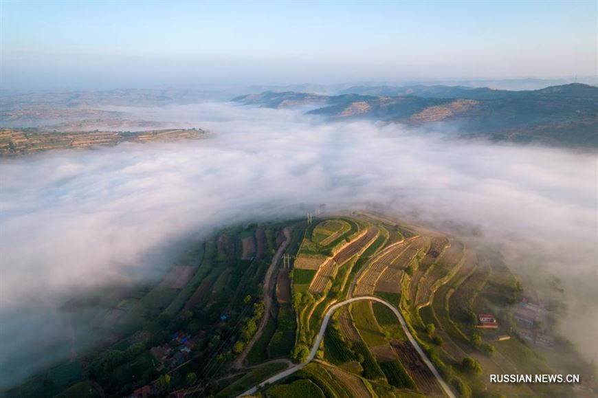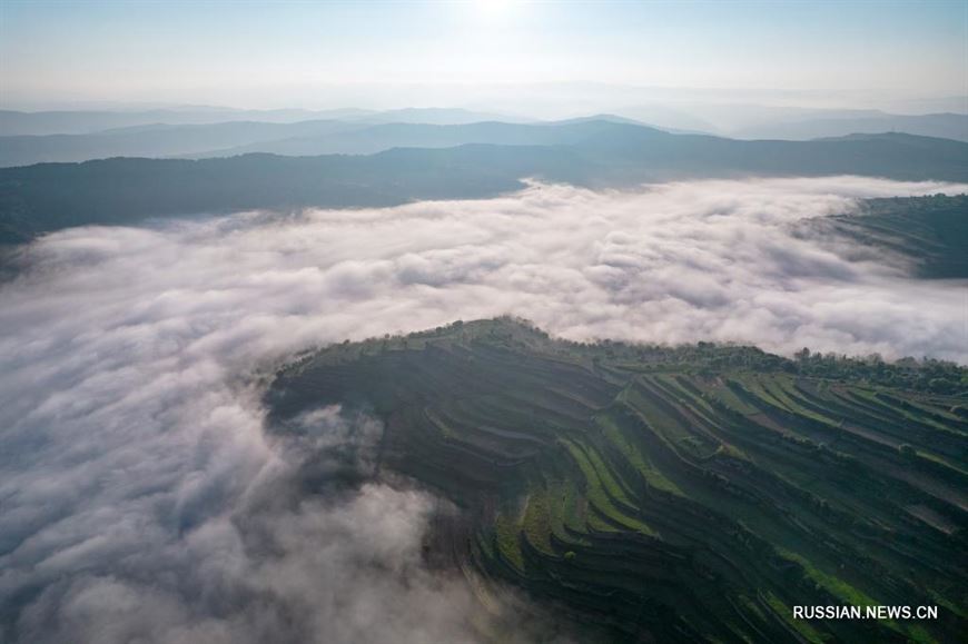 20 июля, Ганьсу /БЕЛТА - СИНЬХУА/. В разгар лета утренние пейзажи террасных полей на Лессовом плато, расположенном в провинции Ганьсу на северо-западе Китая, на фоне белоснежных облаков выглядят особенно живописно.-0-