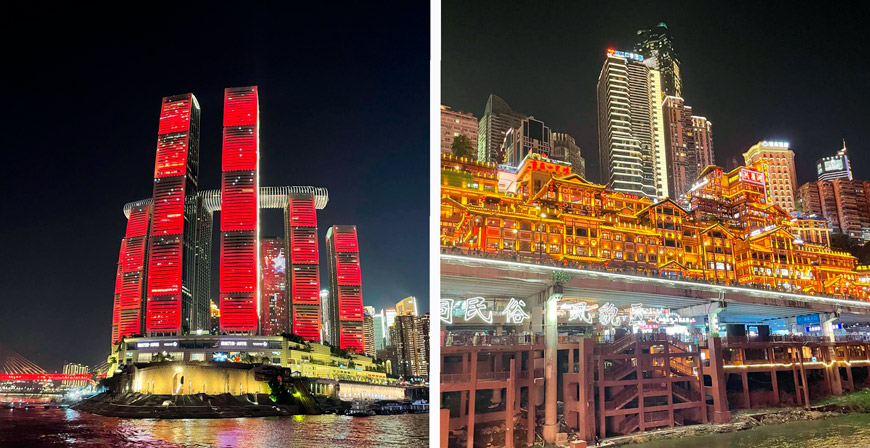Чунцин днем - это утопающий в легкой дымке и жарком солнце город. Горы и дома одного цвета легко сливаются вдали, создавая ощущение единого живописного полотна. Архитекторы и строители мастерски вписали здания, дороги и мосты в природный ландшафт. А здания на склонах спроектированы так, что порой фундамент одного строения оказывается на уровне крыши другого - словно 22-й этаж плавно переходит в первый.Вечерний Чунцин - это настоящий карнавал огней и жизни. Само название города с китайского переводится как "двойное торжество". И вечером город загорается красными, желтыми и синими огнями, словно просыпаясь для ночной прогулки. В районе набережной в девять часов не протолкнуться - все спешат к воде, чтобы прокатиться на многочисленных экскурсионных корабликах и запечатлеть эту красоту с двух рек. Наш корабль был одним из крупнейших - четырехэтажным, где можно было наслаждаться чаем и фруктами, любуясь панорамой и не переставая делать фотографии и видео.