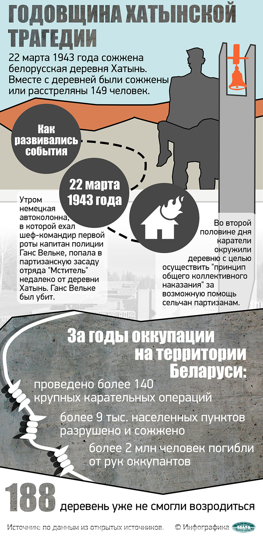 В этом году исполняется 78 лет, как гитлеровские каратели уничтожили белорусскую деревню Хатынь. 22 марта 1943 года они сожгли заживо и расстреляли почти всех жителей - 149 человек, в том числе 75 детей. Созданный на месте Хатыни мемориальный комплекс стал мировым символом бесчисленных жертв, страданий и мужества белорусского народа в Великой Отечественной войне. Судьбу Хатыни разделили сотни других белорусских деревень.-0-