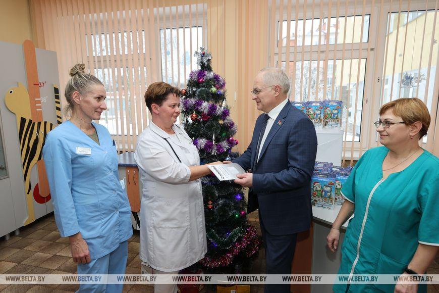 27 декабря, Витебск /Корр. БЕЛТА/. Член Совета Республики, председатель Витебского областного объединения профсоюзов Юрий Деркач поздравил с предстоящим Новым годом и Рождеством маленьких пациентов и медицинских работников педиатрического отделения для детей до года Витебской детской клинической больницы, передает корреспондент БЕЛТА.