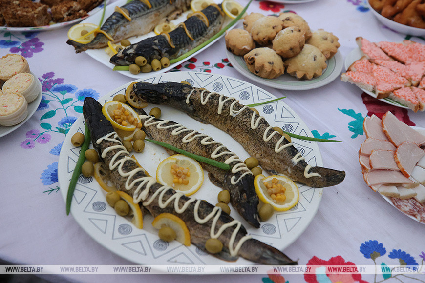 "Гостей обычно встречают хлебом и солью, а мы немного видоизменили эту традицию. На этом тематическом празднике встречаем гостей рыбным караваем. Нежное тесто и все домашнее: яйца, сметана, а также речная рыбка, которую ловит мой муж. Сами готовим и сами рыбку ловим", - говорит Елена Гурина, которая представляет команду из Юратишек.