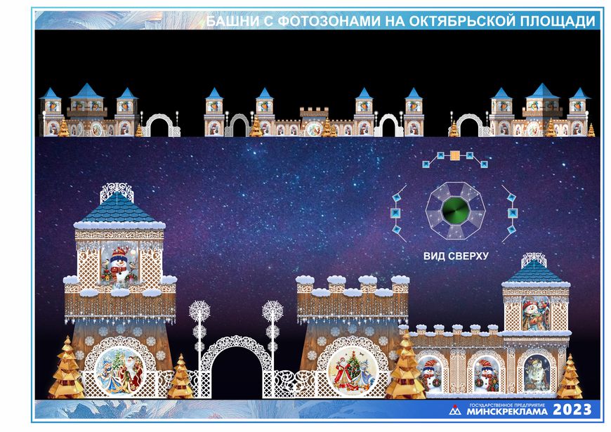 Восхитившись детально проработанным эскизом №1, мы переходим к елке, изображенной на втором эскизе. Вечнозеленая красавица показана на эскизе №2, но по статусу это елка №1 - главная елка страны на Октябрьской площади. 30-метровая красавица будет усыпана 6 тыс. различных игрушек разной цветовой гаммы. По словам Татьяны Бугорковой, "Мингорсвет" разместит на ней также пиксельную сетку, с помощью которой будут транслироваться новогодние картинки. А еще зимнюю красавицу окружат световым фонтаном из арок в ажурном обрамлении. Находиться же эта красота будет в центре сказочного города, в котором живут всем знакомые и любимые новогодние герои. Ажурная фрезеровка сказочного города, созданного на основе рыцарского городка, отсылает к зимней изморози.