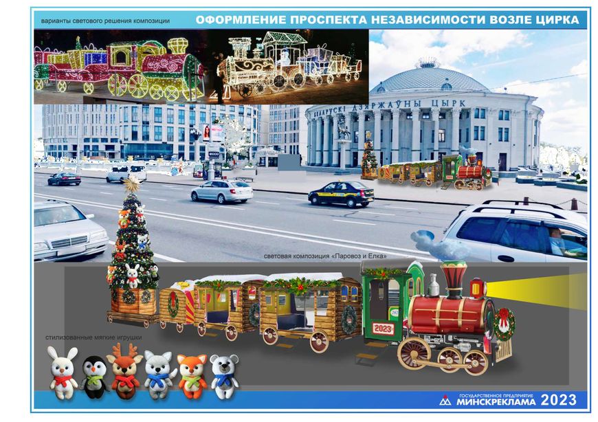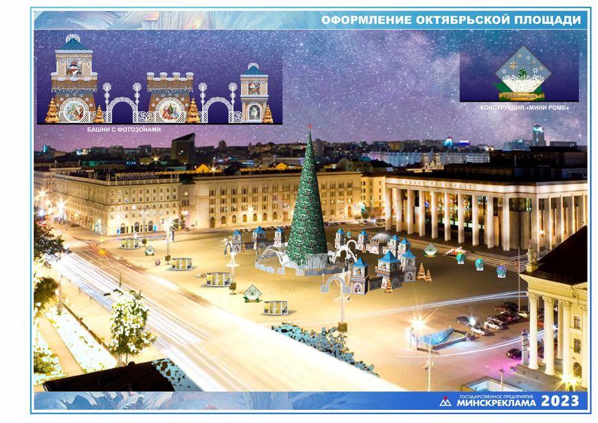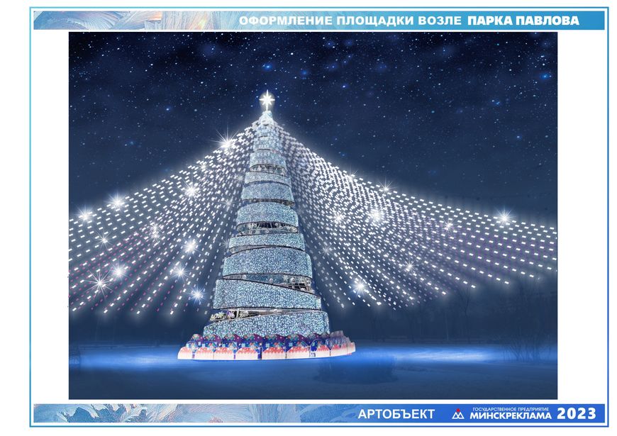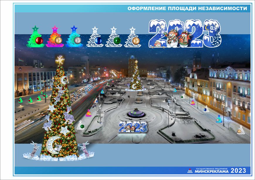 Эскиз №1. На площади Независимости будет установлена одна из самых красивых елок в городе. Новогодняя красавица будет усыпана огромным количеством разнообразных игрушек: и традиционные шары, и плоскостные игрушки. Но главная особенность в том, что ее украсят габаритные игрушки ручной работы, а именно кролики - символ наступающего года. "Мало того, что игрушки сами по себе очень изящные, так они еще и световые. Таким образом, разместив их на елке, мы придадим ей незабываемый колорит. Убеждена: эта елка никого не оставит равнодушным и станет обязательным к посещению местом в новогодние праздники". Кроме того, на площади будут установлены фрезерованные елки с большими нарядными шарами и 4-метровые светящиеся цифры 2023, символизирующие наступление нового года.