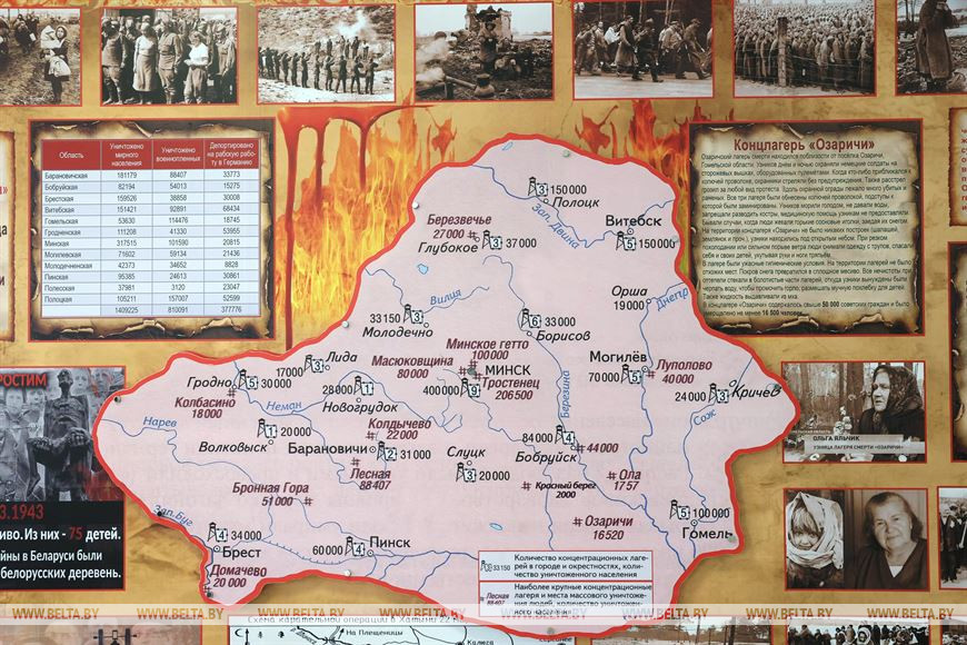 Белорусская прокуратура проводит кропотливую работу: опрашивает очевидцев тех страшных событий, участвует в раскопках мест преступлений нацистских оккупантов, изучает архивные материалы. Уже сейчас достоверно известно о 2 млн 200 тыс. погибших белорусов, 209 уничтоженных городах и районных центрах, 9200 сожженных деревнях. Все эти страшные цифры представлены в одном из разделов экспозиции и сопровождаются еще более страшными кадрами из концлагерей и стертых нацистами с лица земли деревень. В экспозиции нашлось место и для писем прошедших через концлагеря белорусских детей.