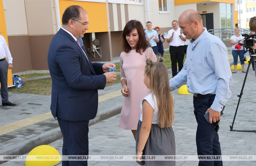 30 июля, Петриков /Корр. БЕЛТА/. Ключи от новых квартир 60 семьям калийщиков Петриковского рудоуправления ОАО "Беларуськалий" вручил генеральный директор Иван Головатый. Это уже пятый по счету дом для молодых семей, построенный в нынешнем году. А до конца 2021 года в Петрикове планируется ввести в эксплуатацию еще четыре 60-квартирных дома в новом микрорайоне.-0-