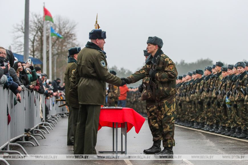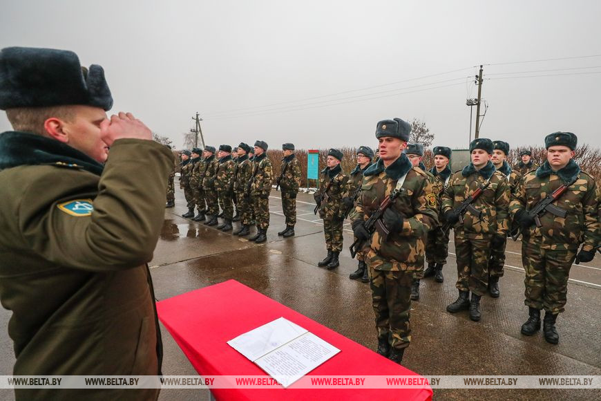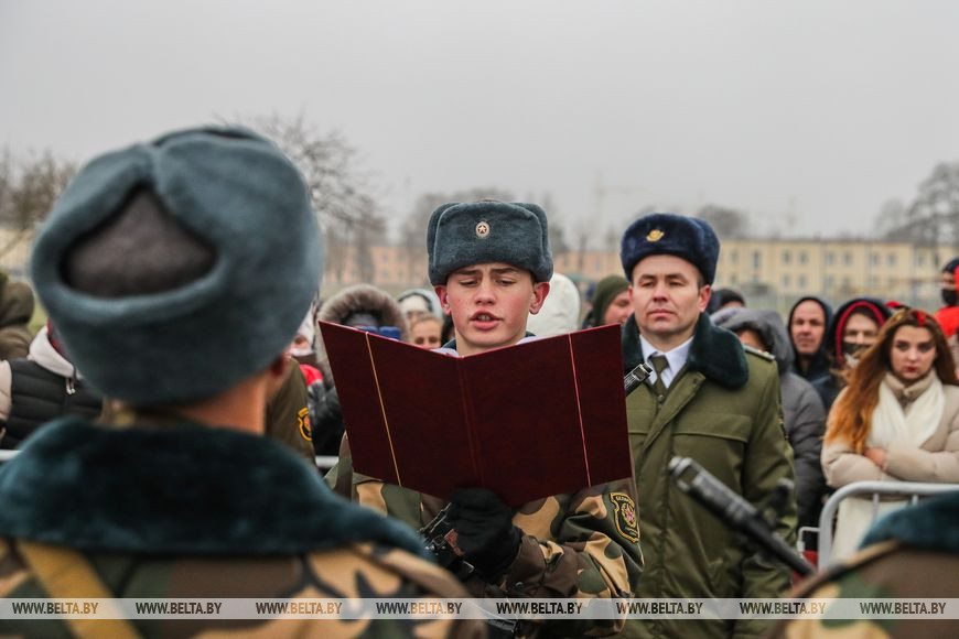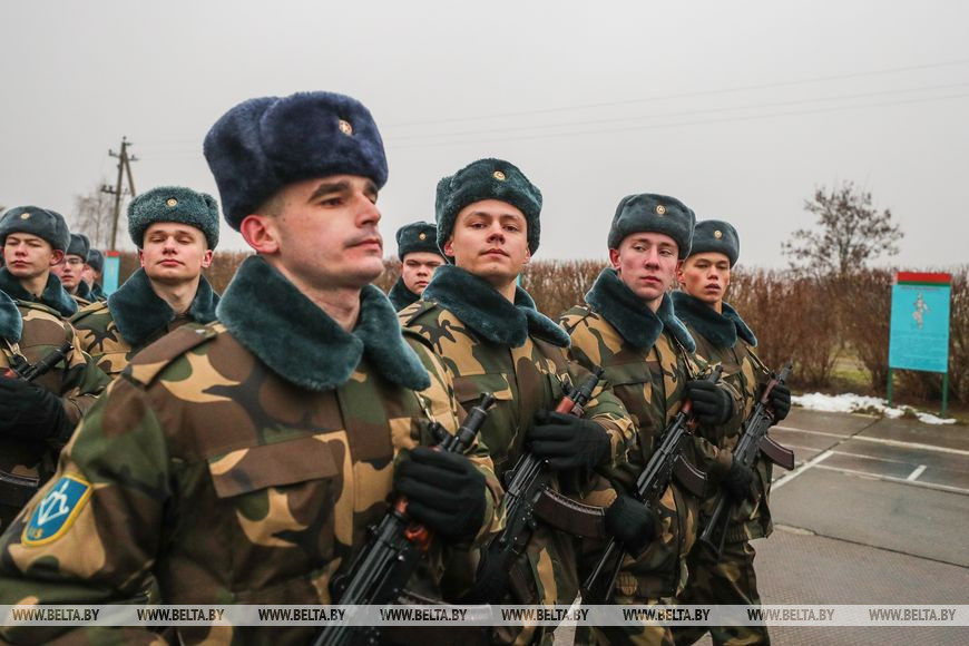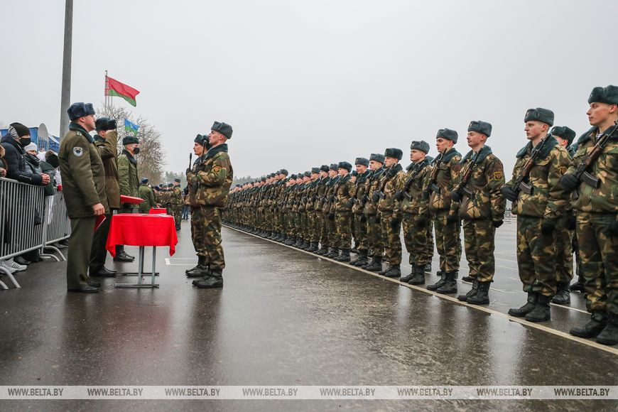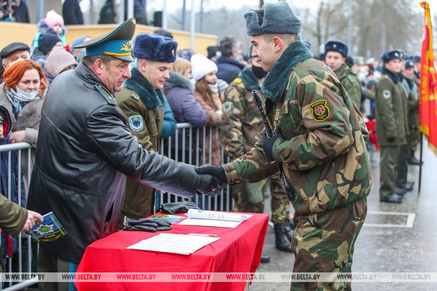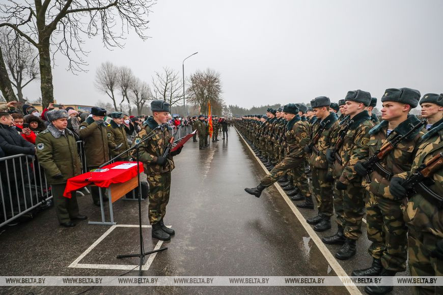 12 декабря, Брест /Корр. БЕЛТА/. 12 декабря новое пополнение Брестского гарнизона приняло военную присягу. В связи с эпидемиологической ситуацией церемонию проводили на территориях войсковых частей гарнизона. Самая скромная прошла на территории войсковой части 115-го зенитного ракетного полка Военно-воздушных сил и войск ПВО. Здесь присягу на верность и защиту Родины и воздушных границ Беларуси приняли около 50 человек. Самое большое пополнение новобранцев - около 700 человек - принесли торжественную клятву в 38-й Брестской отдельной гвардейской десантно-штурмовой Венской Краснознаменной бригаде ССО Вооруженных Сил Республики Беларусь.-0-