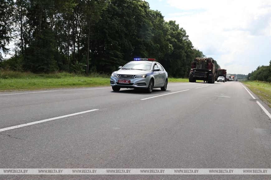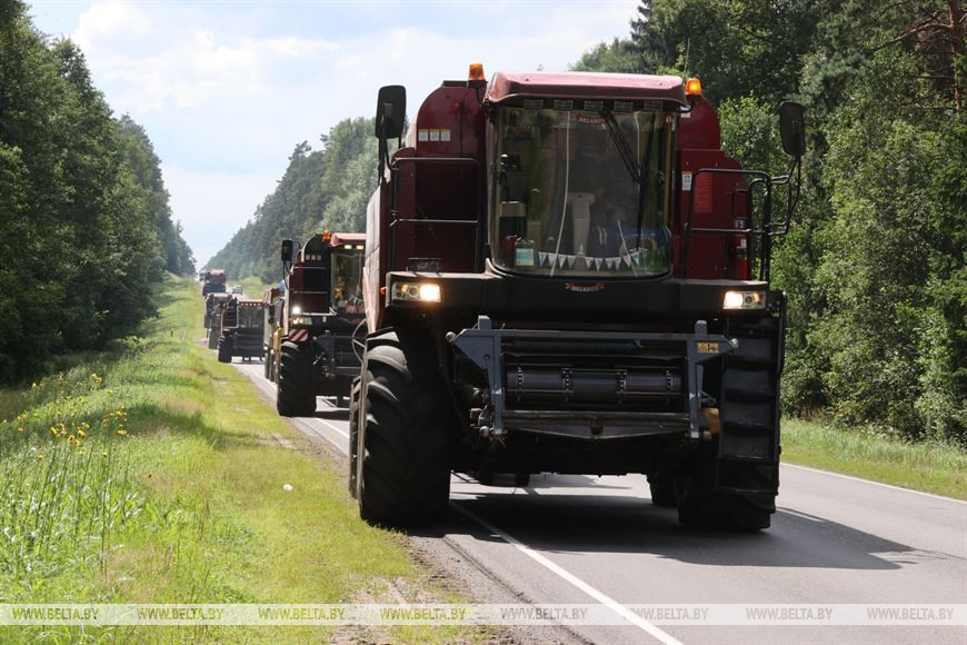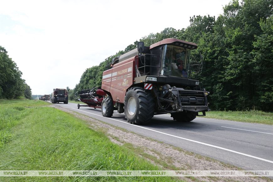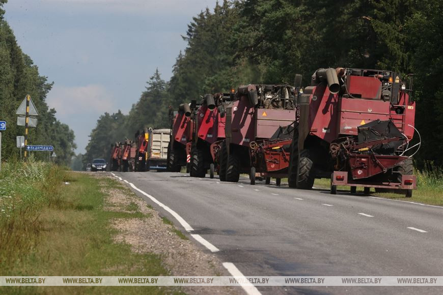 10 августа, Могилев /Корр. БЕЛТА/. Организованная колонна сельхозтехники из 13 комбайнов перебрасывается с южных в северные районы Могилевской области.