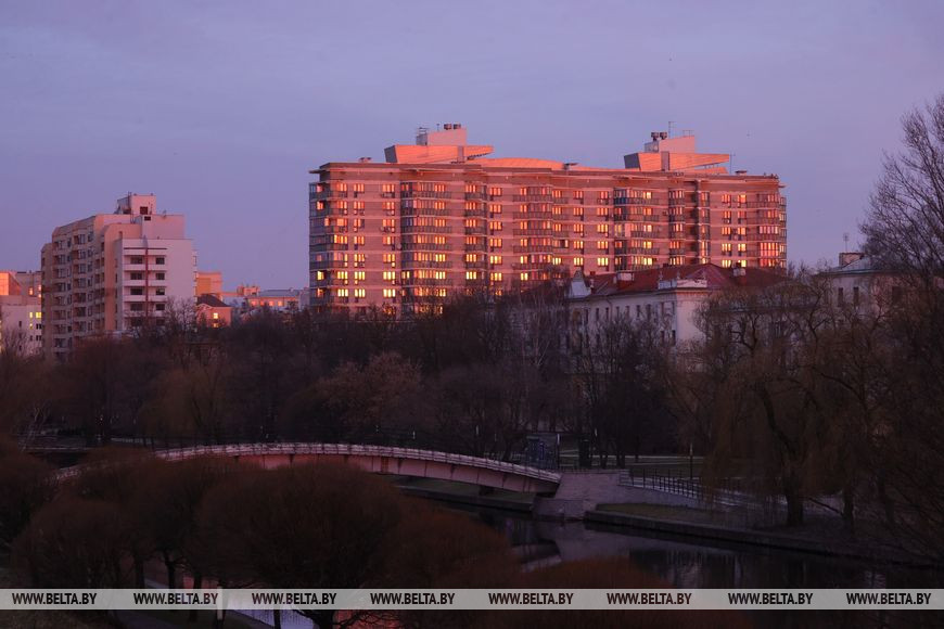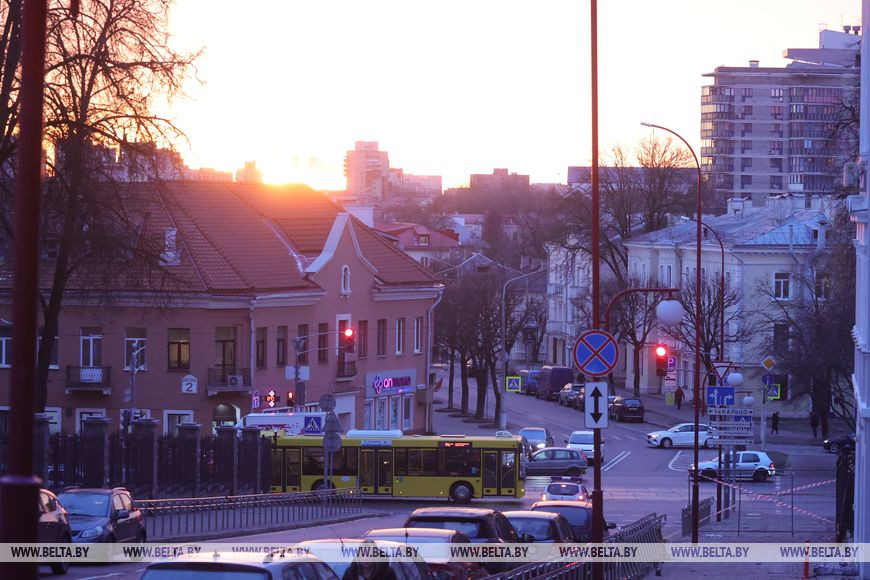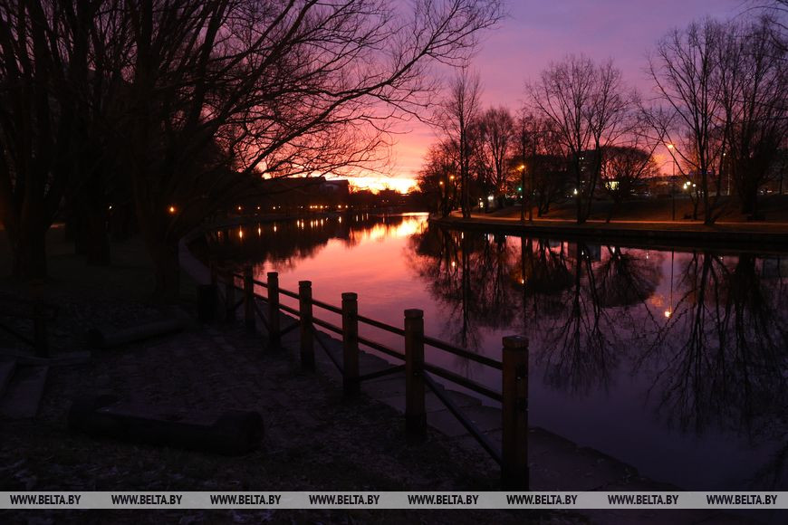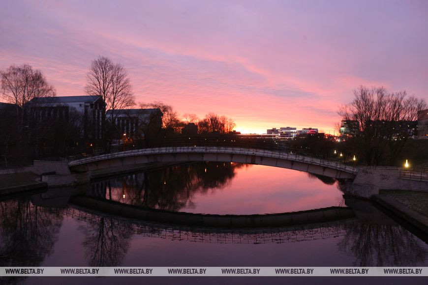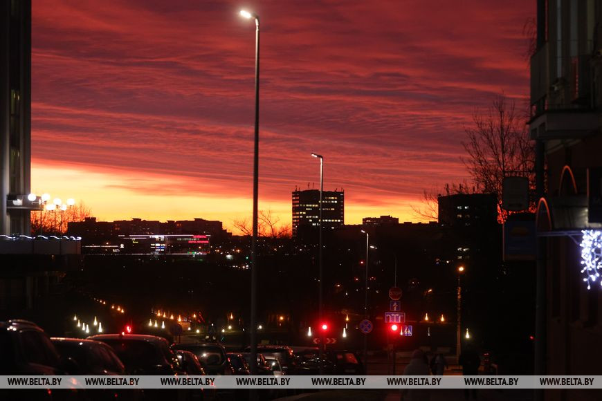 28 декабря, Минск /Корр. БЕЛТА/. Сегодня утром слегка подморозило и небеса окрасились оттенками красного и оранжевого. Солнце взошло, будто расписывая небо кистями огненных оттенков, создавая неповторимый и захватывающий вид.-0-
