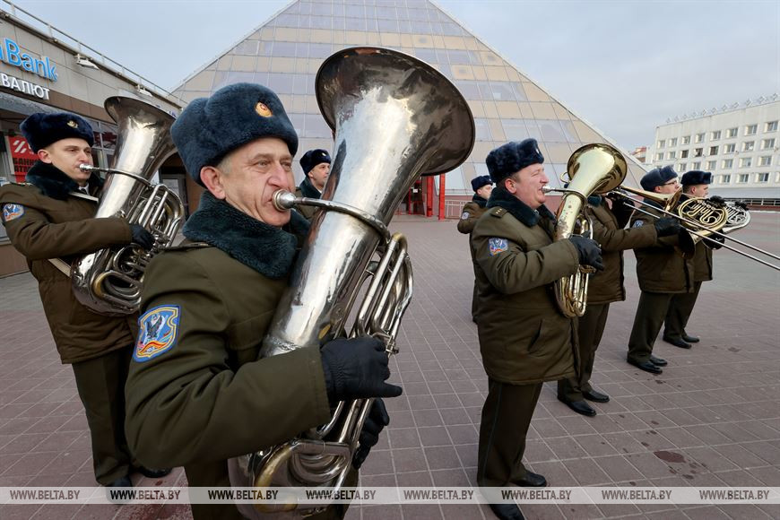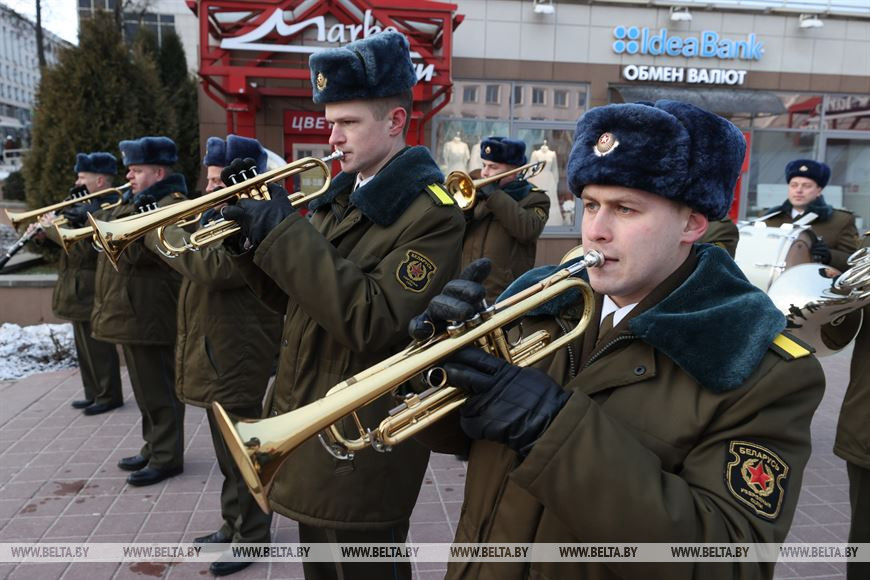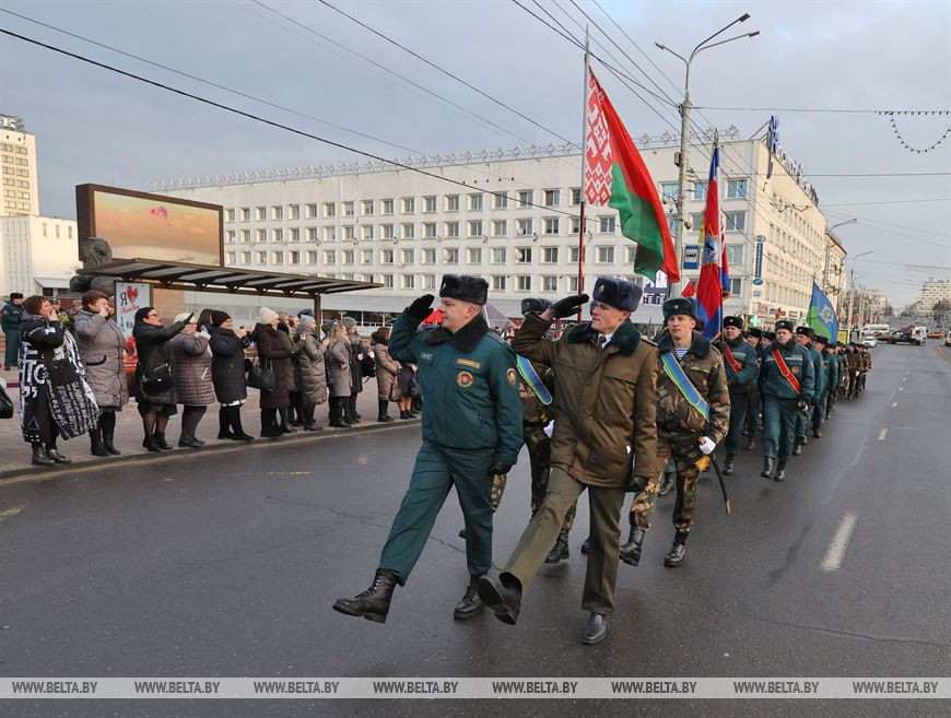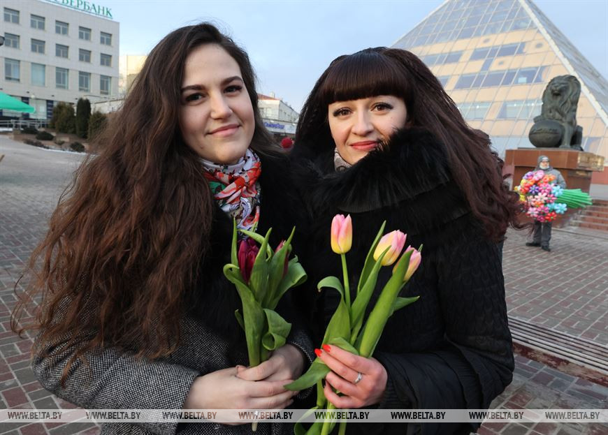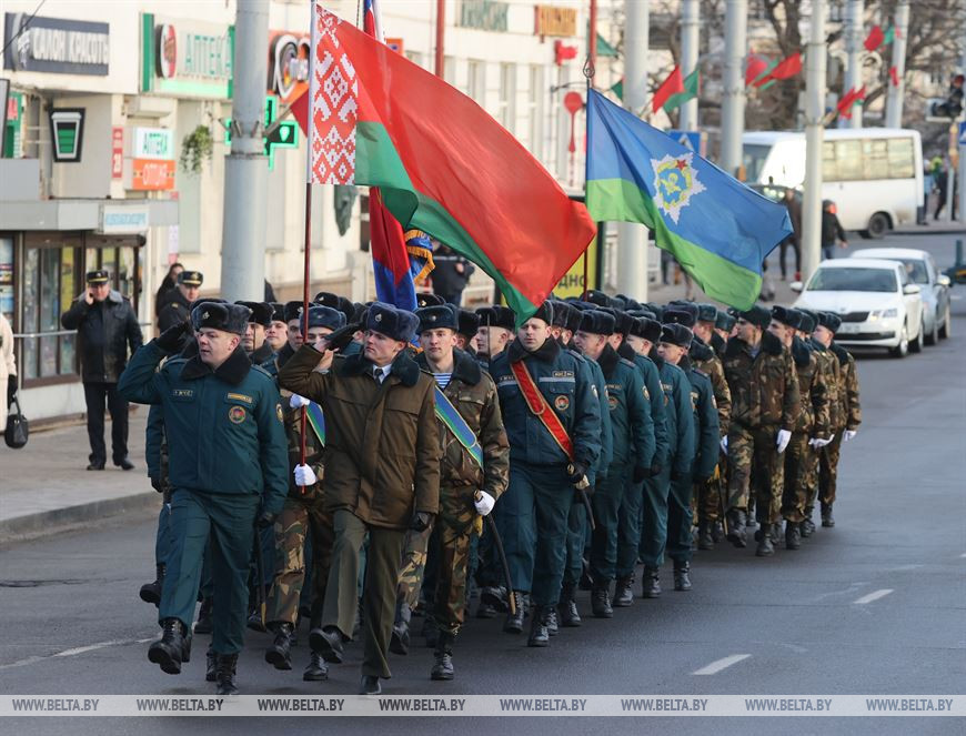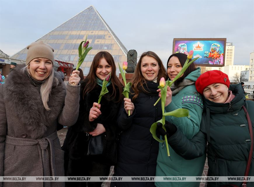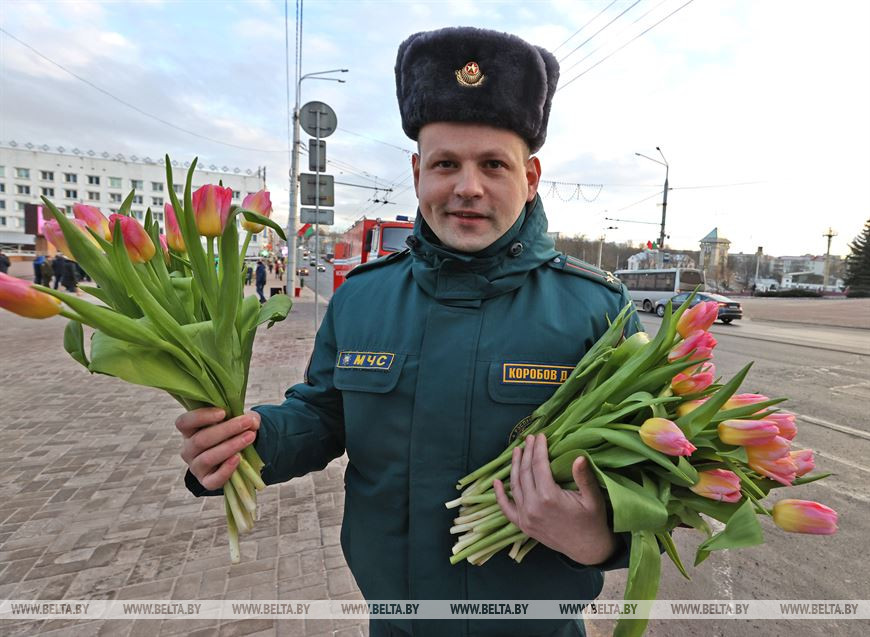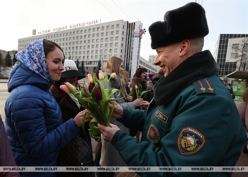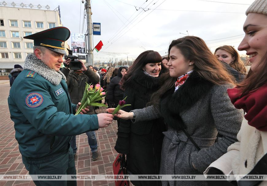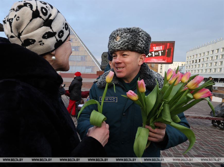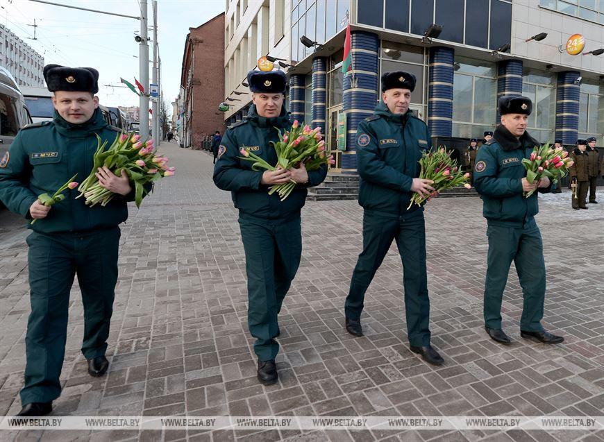 5 марта, Витебск /Корр. БЕЛТА/. 5 марта на площадке возле бизнес-центра руководители подразделений силового блока Витебщины поздравили женщин с Международным женским днем! В честь всех прекрасных дам по улице Ленина с песней прошли два парадных расчета из числа спасателей областного управления МЧС и воинов-десантников 103-й воздушно-десантной бригады.-0-
