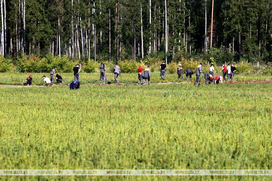 17 августа, Могилев /Корр. БЕЛТА/ Три экологических студенческих отряда "Умельцы", "Защитники природы" и "Эколог" работают на прополке саженцев на базе комплекса по выращиванию лесопосадочного материала закрытой корневой системы Могилевского лесхоза.-0-