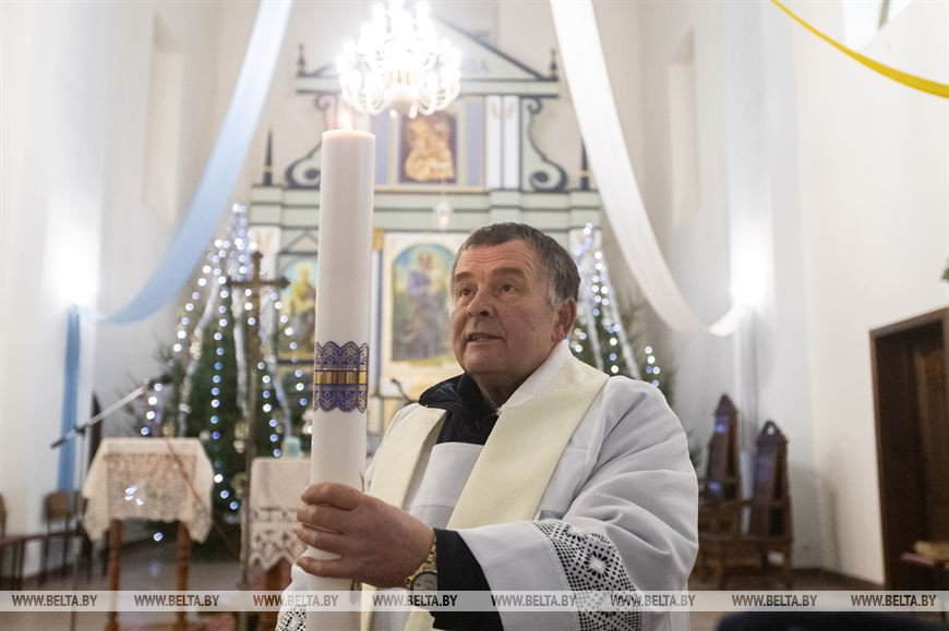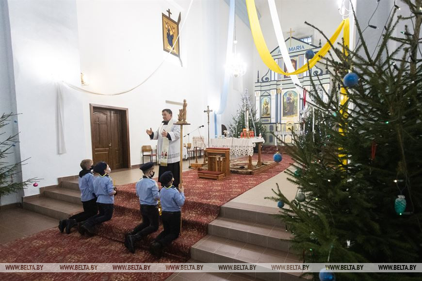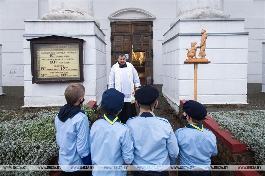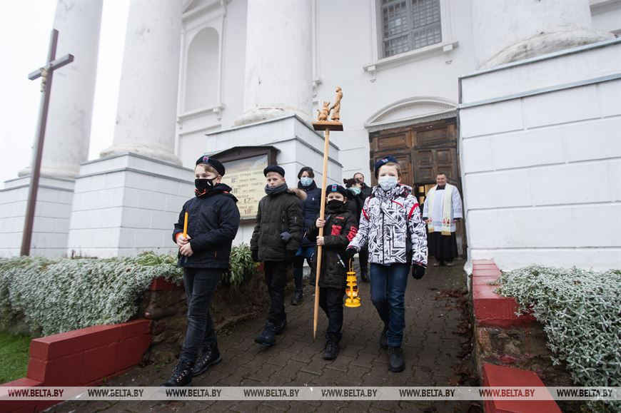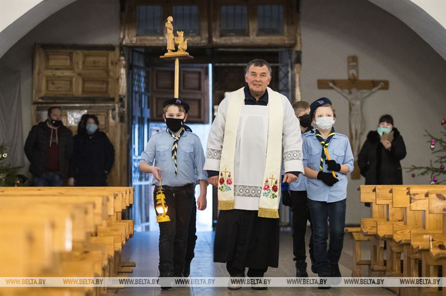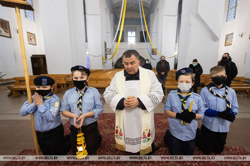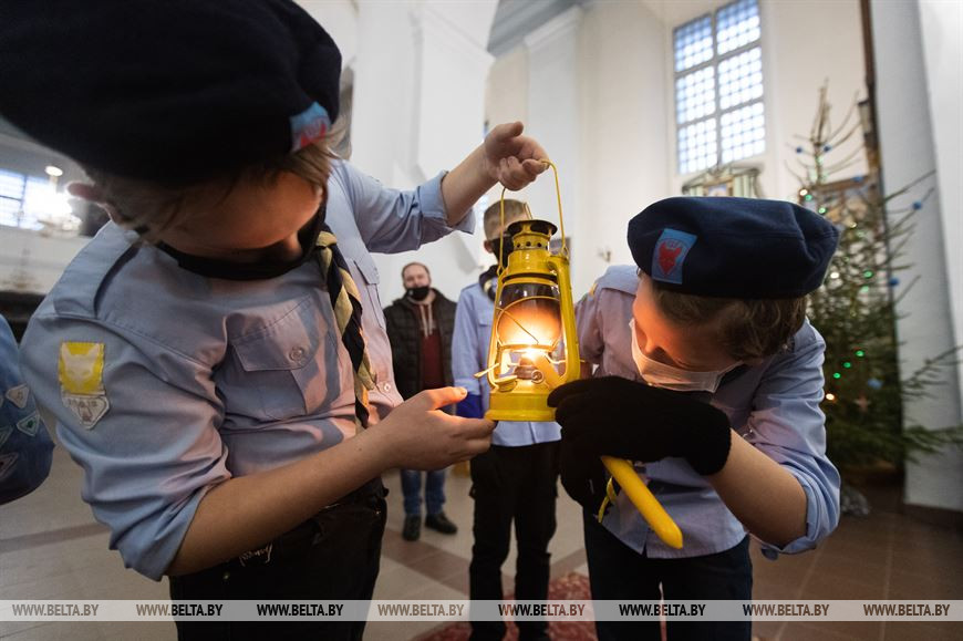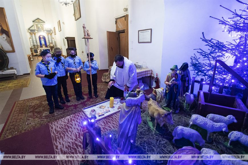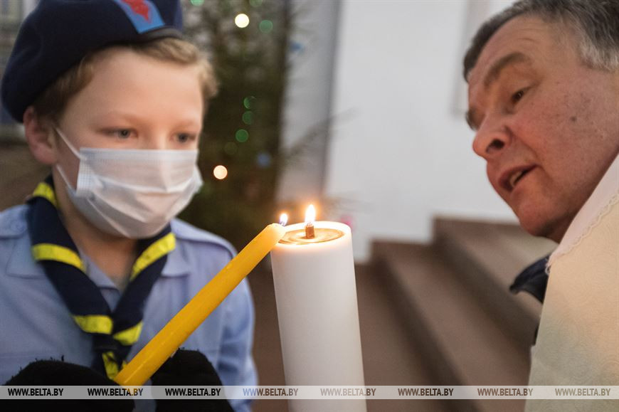 19 декабря, Минск /Корр. БЕЛТА/. В костеле Святого Иосифа (Воложин, Минская область) прошла церемония передачи Вифлеемского огня мира. Символ предстоящего Рождества доставили скауты из католической общины Ивенца. -0-