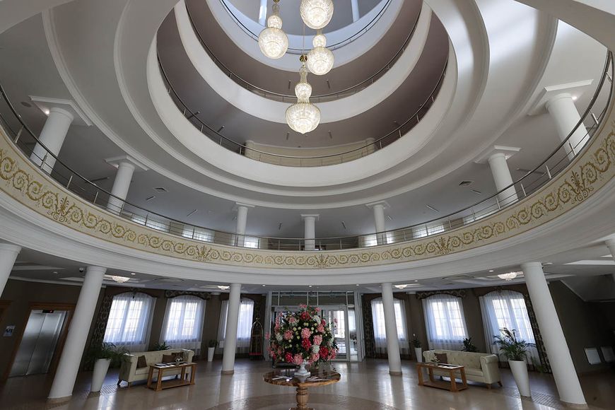 Продуманное до мелких деталей расположение объектов санатория делает пребывание гостей мегакомфортным. Основные здания, которые с высоты птичьего полета напоминают форму креста Евфросинии Полоцкой, соединены переходными галереями. В этих светлых и просторных помещениях гости нередко задерживаются на часы, оставаясь в кресле с книгой или беседуя с другими постояльцами. Особенно они ценят эти галереи в холодную и сырую погоду: из жилого корпуса в лечебный или развлекательный можно проследовать прямо в халате, с кислородным коктейлем из фитобара в руках.