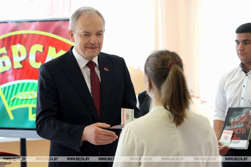 Глава Администрации Президента поздравил ребят со значимым событием в их жизни, пожелал успехов в учебе и жизни. Он обратил внимание, что учащиеся получили свои молодежные билеты в преддверии особо почитаемого белорусами Дня Победы. "Здорово осознавать, что школьники чтят традиции, которые были сформированы предыдущими поколениями. Мы помним о подвиге наших предков в годы Великой Отечественной войны. Нужно помнить, чтобы сохранить наше будущее", - подчеркнул Игорь Сергеенко.-0-