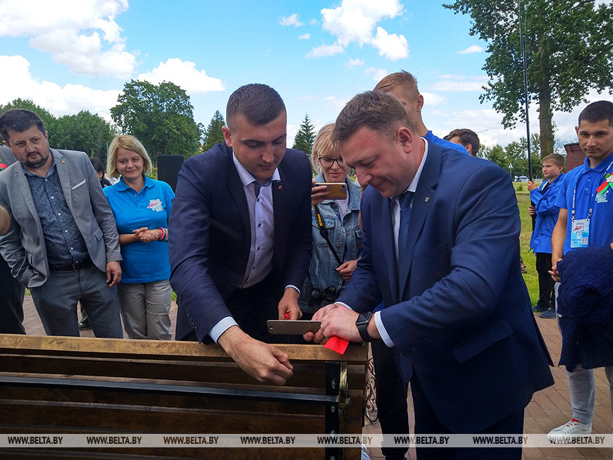 22 июля, Брест /Корр. БЕЛТА/. Брест сегодня принимает участников республиканского молодежного поезда "#Беларусь. Моладзь. Натхненне". Одним из пунктов программы стало открытие именной скамейки от союзной молодежи в Городском саду, передает корреспондент БЕЛТА.