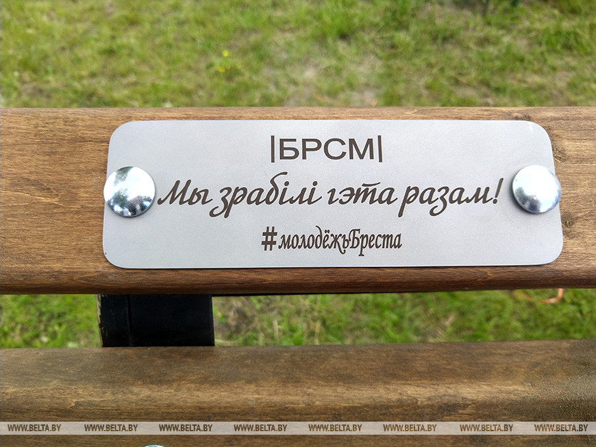 Арт-объект установили на аллее, ведущей к набережной реки Мухавец. На скамейке прикреплена табличка с надписью "БРСМ. Мы зрабілі гэта разам! #молодежьБреста".