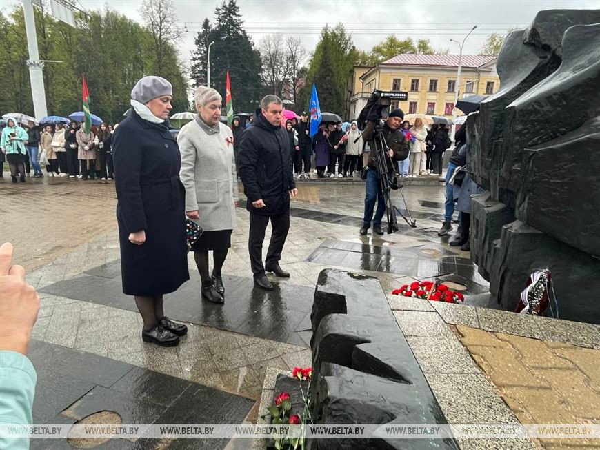 Цветы к мемориалу возложили председатель Белстата, заместитель председателя Постоянной комиссии по экономической политике Палаты представителей Галина Лагунова, глава администрации Заводского района Минска Сергей Масляк, ветераны и представители высших учебных заведений Заводского района Минска.-0-