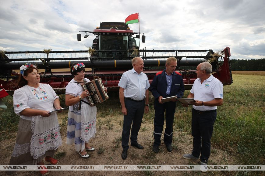 По заслугам и чествование. Представители хозяйства и отраслевого профсоюза поздравили передовика прямо в поле. Первому тысячнику в области вручили грамоту и денежную премию. "Очень важно поддержать комбайнеров, чтобы было полноценное питание, вода чтобы была в достаточном количестве, чтобы в кабине условия были. Надо понимать, что комбайнеры работают от зари до зари. Они любят свою работу, край и любят людей, которых кормят. И мы должны отвечать им взаимностью, - отметил председатель областного объединения профсоюзов, член Совета Республики Виктор Лискович. - Выстроенная в Гродненской области работа позволяет сказать им спасибо за труд. Мы делаем все, чтобы они не просто гордились собой, но и чувствовали заботу о себе. А от этого у них будет повышаться желание делать свою работу еще лучше на благо нашей страны". Как подчеркнул Виктор Лискович, профсоюзы продолжат поддерживать тысячников во всех районах, а также молодые и семейные экипажи, водителей, занятых на перевозке зерна. "Никто не останется без внимания", - заверил он.