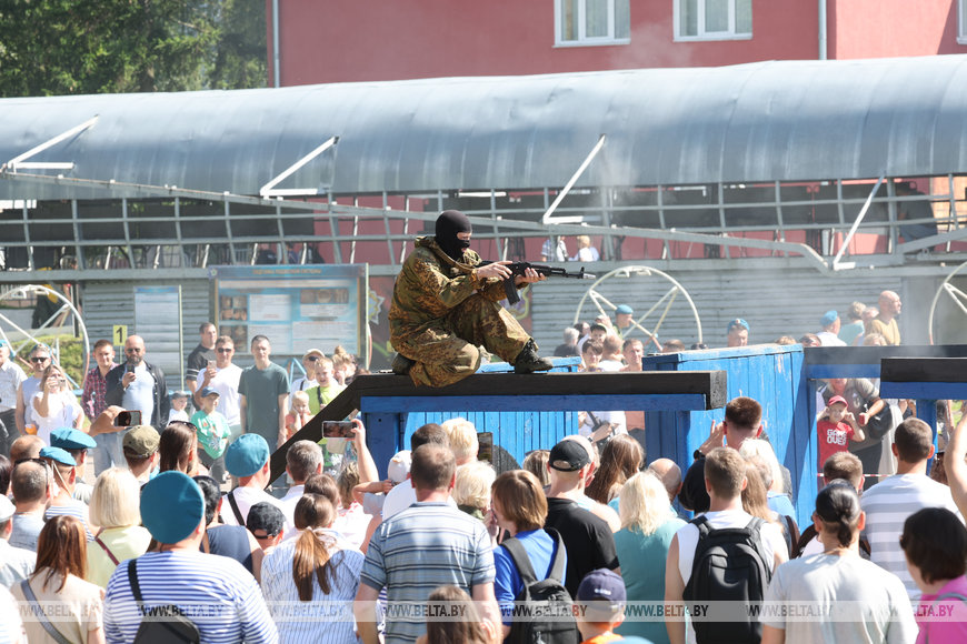 Десантники вместе с клубами реконструкции воссоздали эпизоды Великой Отечественной войны, в частности форсирования Днепра, Афганского конфликта - нападение душманов на колонну бойцов, возвращавшихся домой, а также продемонстрировали навыки современной тактики ведения боя. Стрелковое вооружение, автотехника, включая бронированную, произвели на зрителей яркое впечатление. Спортсмены и разведчики прославленного соединения показали, какие они ловкие и смелые на ринге и в сражении с противником, что им по силам завоевать победу на борцовском татами и в два счета обезвредить диверсанта. Также витебские воины в голубых беретах обладают творческими способностями, они поют и играют на музыкальных инструментах, а духовой оркестр бригады является одним из известных коллективов в Беларуси. Его выступление дополнило праздничную программу на плацу.