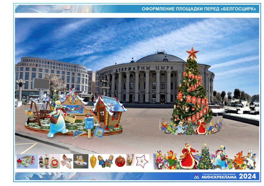 Высота елки на площади Независимости составит 18 м. Она будет объемной и пушистой - не такой, как привычные каркасные елки, напомнит настоящую раскидистую беловежскую ель. Для нее дизайнеры предложили парадную золотую гамму. Такая же ель разместится у Белгосцирка. Ее наряд будет оформлен в стиле ретро - с персонажами советских сказок и мультфильмов, гирляндами из красных флажков и набивных игрушек ручной работы. Возле самого цирка появится "Сказочная полянка" с деревянными домиками. Там же разместится снеговик-почтовик с сумкой ретрооткрыток.