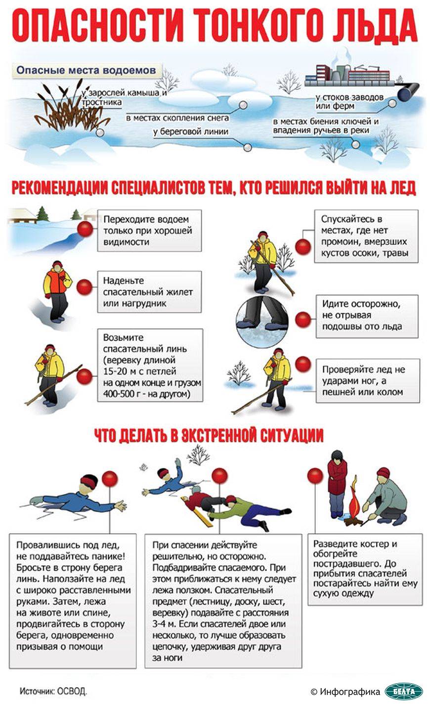 В первую очередь от выхода на непрочную поверхность водоемов предостерегают любителей зимней рыбалки. Им рекомендуют надевать спасательный жилет, брать с собой веревку длиной 15-20 м, чтобы была возможность помочь оказавшемуся в беде человеку. Кроме того, родителям нужно контролировать местонахождение детей. "Если пробыть в холодной воде больше пяти минут, у человека появляются мышечные спазмы, затрудняется дыхание. Плюс намокает одежда, и, соответственно, человек тонет. Конечно, многое зависит от физиологических особенностей: кто-то может продержаться в воде дольше, кто-то меньше. Поэтому стоит заранее позаботиться о своей безопасности", - призвали в ОСВОД.