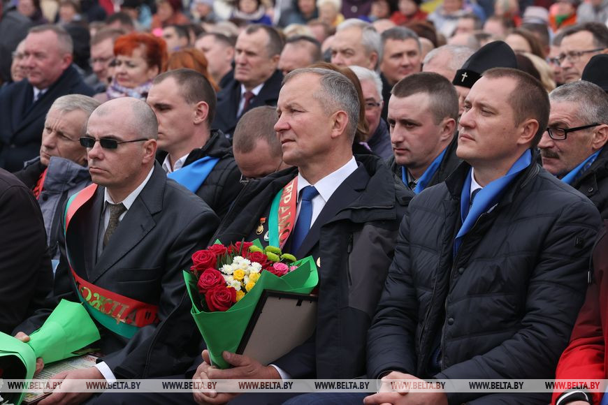 Передовиков на главной сцене поздравили с достижением высоких результатов и общий вклад в хлебный каравай страны глава Администрации Президента Игорь Сергеенко, заместитель премьер-министра Беларуси Леонид Заяц, министр сельского хозяйства и продовольствия Игорь Брыло, председатель Могилевского облисполкома Анатолий Исаченко, а также другие почетные гости праздника. Церемония чествования аграриев началась с презентации караваев и дожиночных снопов всех районов области, а также поднятия флага фестиваля-ярмарки тружеников села.