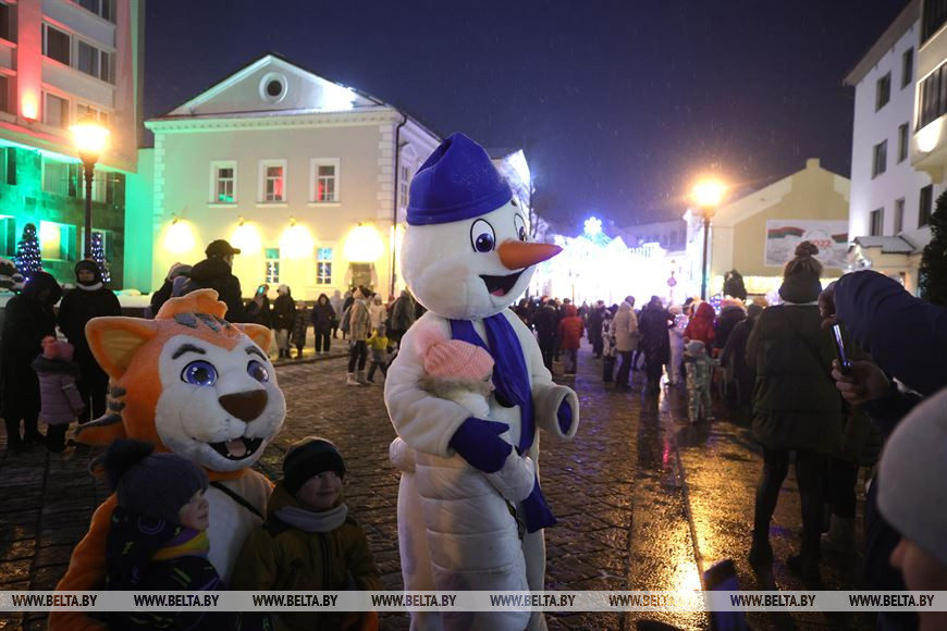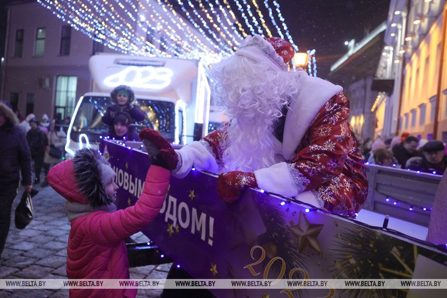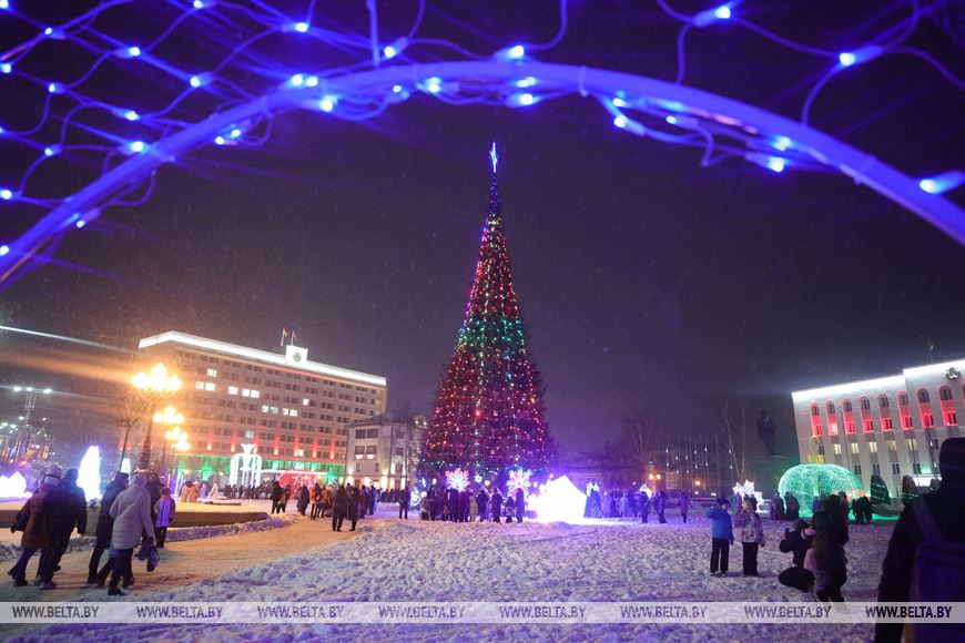 Главный Дед Мороз Гродно прибыл в областной центр на новогоднем экспрессе. По центральным улицам от железнодорожного вокзала проследовал парад-кортеж костюмированных машин. Кортеж прибыл на площадь Ленина, где в праздничном ожидании томились коллеги главного Деда Мороза. Колонна зимних волшебников прошла по улице Советской и добралась до главной площади города, где благодаря общим усилиям засияла новогодняя красавица.-0-