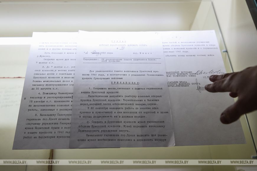 Она показывает нам и другое сокровище: приказ №1 о создании сводного штаба обороны цитадели. Его составили на третий день войны в казарме инженерного полка, где сейчас и находится Музей обороны. Документ нашли в 1950 году в сумке неизвестного командира. Из него стали известны имена тех, кто возглавил штаб и план действий, чтобы прорваться за пределы крепости.