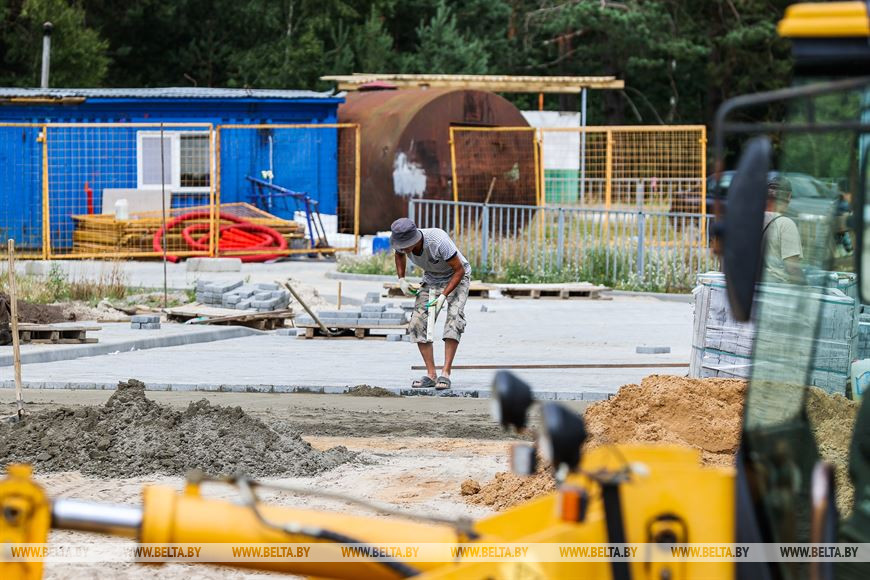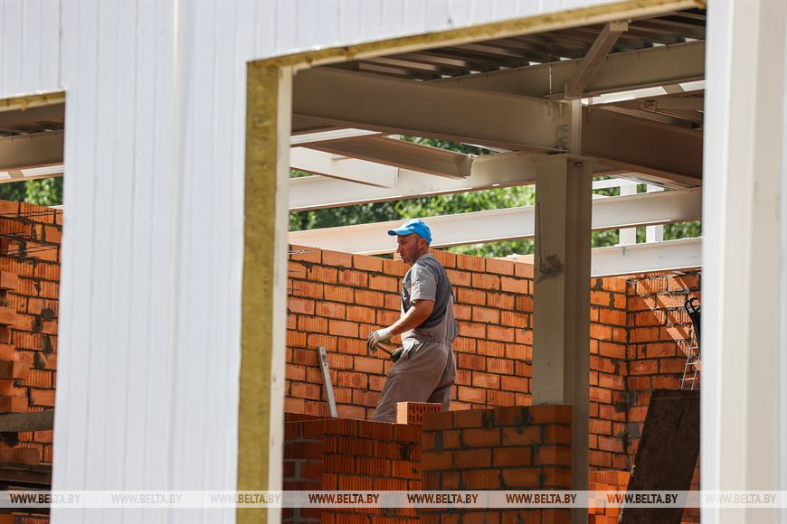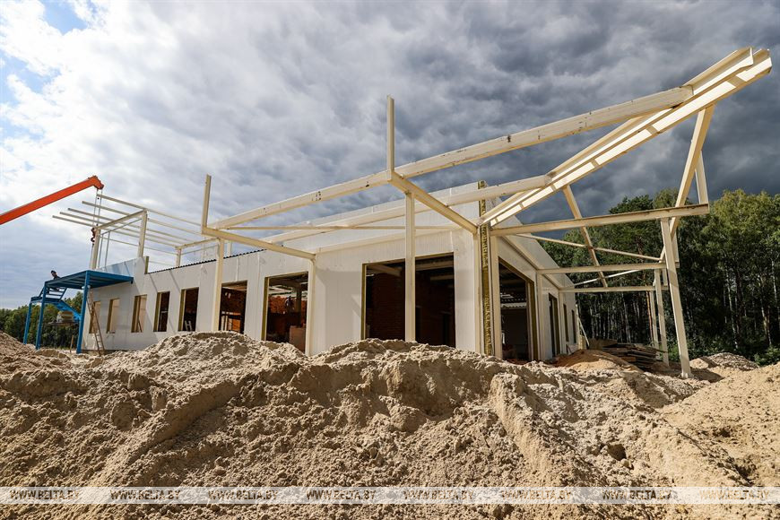Сейчас идет второй этап. Строители возводят административное здание и укладывают плитку. До конца этого года, если не случится форс-мажора, комплекс планируют сдать в эксплуатацию. У прораба филиала ПМК-17 ОАО "Полесьежилстрой" Анатолия Семенюка за 33 года работы в строительстве было множество объектов, нынешний - особенный. "У меня уже второй такой необычный объект. До этого строил аварийно-спасательную часть МЧС в Каменце. Этот проект не сложный, но индивидуальный. Здание состоит из металлокаркаса и обшито сэндвич-панелями, внутри кирпичные перегородки", - рассказал специалист. На объекте сейчас трудятся монтажники, каменщики и укладчики тротуарной плитки.