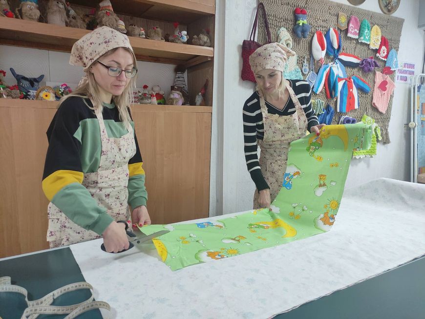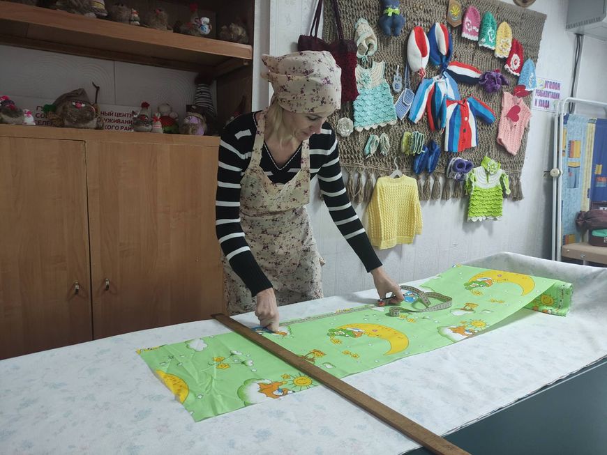 Руководитель кружка рассказала, что больше всего ей нравится работать с ножницами, хотя весь процесс шитья от раскроя до готового изделия неизменно приносит ей большое удовольствие. Рулоны ткани ТЦСОН закупает за свои средства. "Работаем с 100-процентным хлопком. Поскольку я не могу поднимать тяжелые рулоны из-за проблем с правой рукой, мне помогают заведующие отделениями, директор центра, другие руководители кружков - у нас очень дружный коллектив, почти семья, никто никогда не откажет. И когда на столе оказывается ткань, я начинаю раскраивать ее - для меня это своего рода поэзия", - поделилась Светлана.