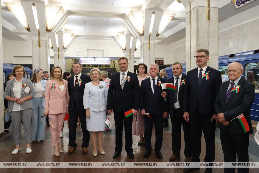 Состав в День Независимости встречали около 150 минчан: учащиеся учреждений образования столицы, представители трудовых коллективов, сотрудники Минского городского исполнительного комитета и Минского метрополитена. Именно они первыми оценили новое убранство вагонов.