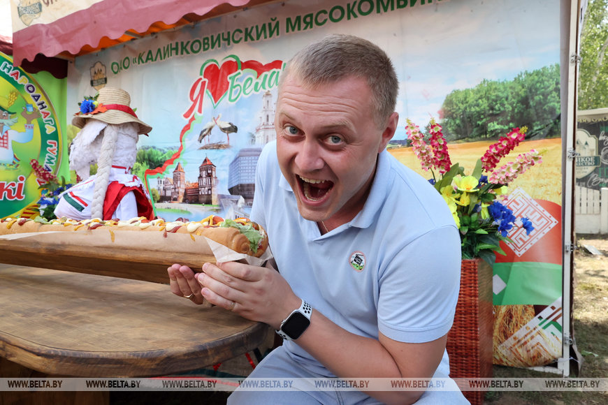 А вот житель Калинковичей Андрей Алексеевич стал одним из первых обладателей двух кусочков от гастрономического рекордсмена этого дня - трехметрового хот-дога от местного мясокомбината. "Пришлось немножко попотеть в очереди за этим угощением. Да, взял два кусочка, один - для жены, ее угощу сначала, обожду минут пять - и сам попробую, - заливается от смеха гость фестиваля. - Это шутка, конечно".