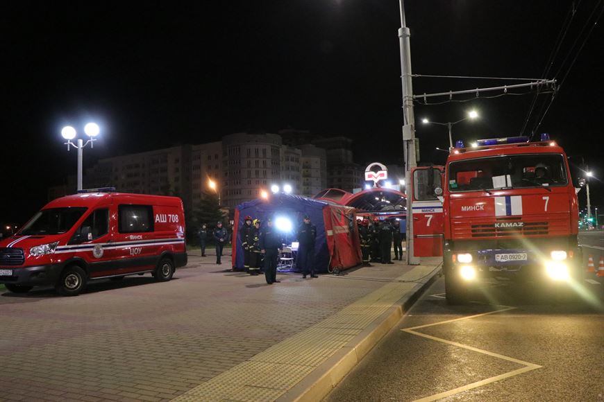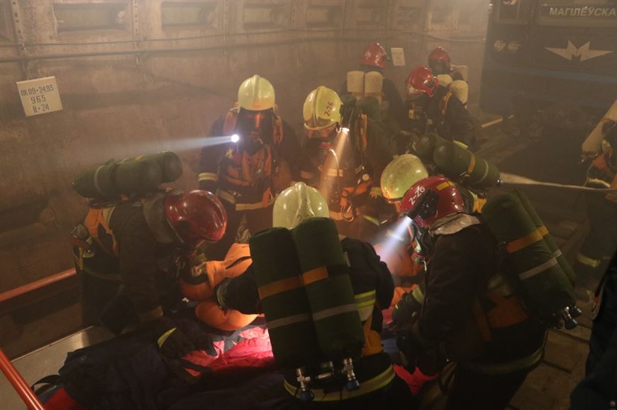 На месте учений был создан штаб ликвидации чрезвычайной ситуации, где находящийся на месте руководитель учений определял вводные задачи для отработки навыков, проверял слаженность действий и грамотное принятие решений, организовывал связь на пожаре. Учитывая, что подвижной состав сошел с рельсов, работники отряда специального назначения "ЗУБР" с тяжелым аварийно-спасательным оборудованием вместе с аварийно-восстановительной бригадой Минского метрополитена проводили восстановительные работы по подъему состава.